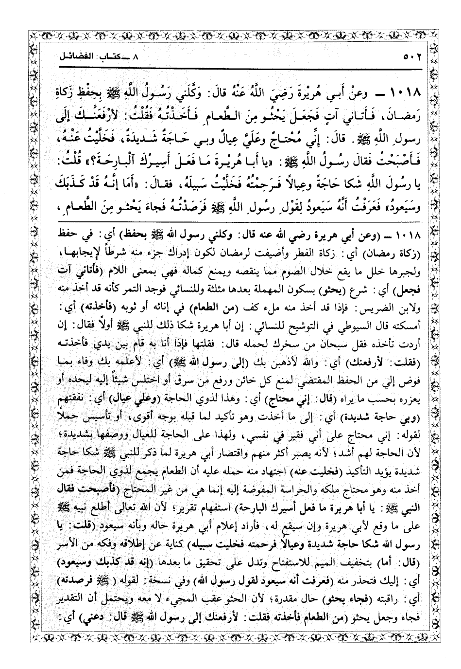 121020 - (وعن أبي هريرة رضي الله عنه قال: وكلني رسول الله بحفظ) أي في حفظ (زكاة رمضان) أي زكاة الفطر، وأضيفت لرمضان لكون إدراك جزء منه شرطاً لإيجابها ولجبرها خلل ما يقع خلال الصوم مما ينقصه ويمنع كماله فهي بمعنى اللام (فأتاني آت فجعل) أي شرع (يحثو) بسكون المهملة بعدها مثلثة، وللنسائي: فوجد التمر كأنه قد أخذ منه، ولابن الضريس: فإذا قد أخذ منه ملء كف (من الطعام) في إنائه أو ثوره (فأخذته) أي أمسكته، قال السيوطي في «التوشيح» للنسائي: إن أبا هريرة شكا ذلك للنبي أولاً فقال: إن أردت تأخذه فقل: سبحان من سخرك لحمله، قال: فقلتها فإذا أنا به قام بين يديّ فأخذته (فقلت: لأرفعنك) أي والله لأذهبن بك (إلى رسول الله) أي لأعلمه بك وفاء بما فوّض إليّ من الحفظ المقتضى لمنع كل خائن ورفع من سرق أو اختلس شيئاً إليه ليحده أو يعزره بحسب ما يراه (قال: إني محتاج) أي وهذا لذوي الحاجة (وعليّ عيال) أي نفقتهم (وبي حاجة شديدة) أي إلى ما أخذت وهو تأكيد لما قبله بوجه أقوى أو تأسيس حملاً لقوله إني محتاج على أني فقير في نفسي ولهذا عليّ الحاجة للعيال ووصفها بشديدة لأن الحاجة لهم أشد لأنه يصبر أكثر منهم، واقتصار أبي هريرة لما ذكر النبي على قوله شكا حاجة شديدة يؤيد التأكيد (فخليت عنه) اجتهاد منه حمله عليه أن الطعام بجمع لذوي الحاجة، فمن أخذ منه وهو محتاج ملكه والحراسة المفوضة إليه إنما هي من غير المحتاج (فأصبحت فقال رسول الله: يا أبا هريرة ما فعل أسيرك البارحة؟) واستفهام تقرير لأن الله تعالى أطلع نبيه على ما وقع لأبي هريرة وأن سيقع له، فأراد إعلام أبي هريرة حاله وبأنه سيعود (قلت: يا رسول الله شكا حاجة شديدة وعيالاً فرحمته فخليت سبيله) كناية عن إطلاقه وفكه من الأسر (قال: أما) بتخفيف الميم للاستفتاح وتدل على تحقيق ما بعدها (إنه قد كذبك وسيعود) أي إليك فتحذر منه (فعرفت أنه سيعود لقول رسول الله) وفي نسخة