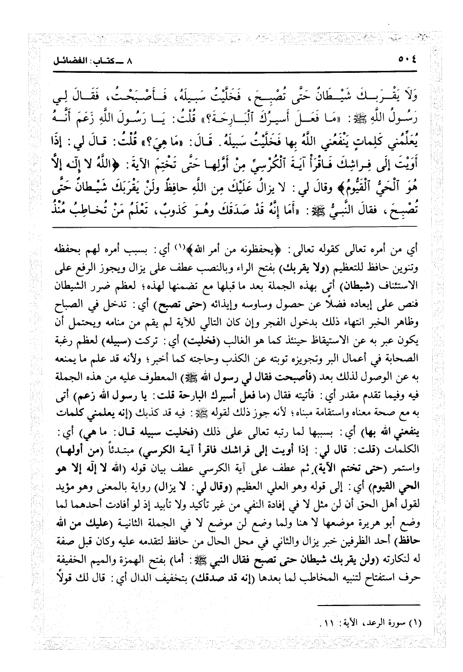 {يحفظونه من أمر الله} (الرعد: 11) أي بسبب أمره لهم بحفظه وتنوين حافظ للتعظيم (ولا يقربك) بفتح الراء وبالنصب عطف على يزال، ويجوز الرفع على الاستئناف (شيطان) أتى بهذه الجملة بعد ما قبلها مع تضمنها لهذه لعظم ضرر الشيطان، فنص على إبعاده فضلاً عن حصول وساوسه وإيذائه (حتى تصبح) أي تدخل في الصباح، وظاهر الخبر انتهاء ذلك بدخول الفجر وإن كان التالي للآية لم يقم من منامه، ويحتمل أن يكون عبر به عن الاستيقاظ حينئذ كما هو الغالب (فخليت) أي تركت (سبيله) لعظم رغبة الصحابة في أعمال البر وتجويزه توبته عن الكذب وحاجته كما أخبر ولأنه قد علم ما يمنعه به عن الوصول لذلك بعد (فأصبحت فقال لي رسول الله) المعطوف عليه من هذه الجملة فيه وفيما تقدم مقدر: أي فأتيته فقال (ما فعل أسيرك البارحة؟ قلت: يا رسول الله زعم) أتى به مع صحة معناه واستقامة مبناه، لأنه جوّز ذلك لقوله فيه قد كذبك (أنه يعلمني كلمات ينفعني الله بها) أي بسببها لما رتبه تعالى على ذلك (فخليت سبيله، قال: ما هي) أي الكلمات (قلت: قال لي: إذا أويت إلى فراشك فاقرأ آية الكرسي) مبتدئاً (من أولها) واستمر (حتى تختم الآية) ثم عطف على آية الكرسي عطف بيان قوله (الله لا إله إلا هو الحي القيوم) أي إلى قوله: {وهو العليّ العظيم} (وقال لي لا يزل) رواية بالمعنى، وهو مؤيد لقول أهل الحق إن لن مثل «لا» في إفادة النفي من غير تأكيد ولا تأييد، إذ لو أفادت أحدهما لما وضع أبو هريرة موضعها لا هنا، ولما وضع لن موضع لا في الجملة الثانية (عليك من الله حافظ) أحد الطرفين خبر يزال، والثاني في محل الحال من حافظ لتقدمه عليه وكان قبل صفة له لنكارته (ولن يقربك شيطان حتى تصبح، فقال النبي: أما) بفتح الهمزة والميم الخفيفة حرف استفتاح لتنبيه