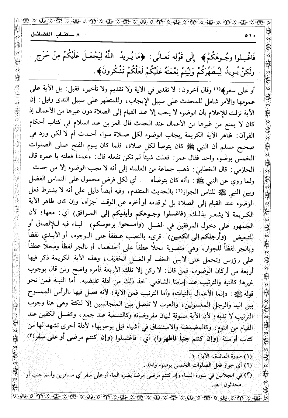 أو على سفر} (المائدة: 6) وقال آخرون: لا تقدير في الآية ولا تقديم ولا تأخير، فقيل بل الآية على عمومها والأمر شامل للمحدث على سبيل الإيجاب وللمتطهر على سبيل الندب. وقيل إن الآية نزلت للإعلام بأن الوضوء لا يجب إلا عند القيام إلى الصلاة دون غيرها من الأعمال، إذ كان لا يمنع من غيرها من الأعمال عند الحدث. قال العز بن عبد السلام في كتاب «أحكام القرآن» : ظاهر الآية الكريمة إيجاب الوضوء لكل صلاة سواء أحدث أم لا، لكن ورد في «صحيح مسلم» «أن النبي كان يتوضأ لكل صلاة، فلما كان يوم الفتح صلى الصلوات الخمس بوضوء واحد، فقال عمر: فعلت شيئاً لم تكن تفعله، قال: عمداً فعلته يا عمر» قال الحازمي: قال الخطابي: ذهب جماعة من العلماء إلى أنه لا يجب الوضوء إلا من حدث، وما روي عن النبيّ أنه كان يتوضأ: أي لكل فرض محمول على التماس الفضل وبين النبي للناس الجواز بالحديث المتقدم. وفيه أيضاً دليل على أنه لا يشترط فعل الوضوء عند القيام إلى الصلاة، بل لو قدمه أو أخره عن الوقت أجزأه وإن كان ظاهر الآية الكريمة لا يشعر بذلك ( {فاغسلوا وجوهكم وأيديكم إلى المرافق} ) أي معها لأن الجمهور على دخول المرفقين في الغسل