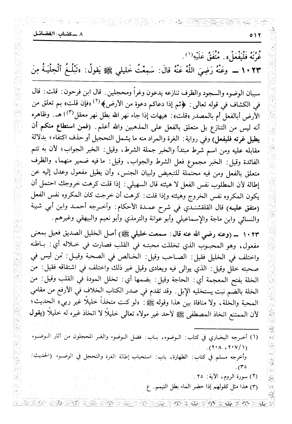 {إذا دعاكم دعوة من الأرض} (الروم: 25) فإن قلت: بم تعلق من الأرض أبالفعل أم بالمصدر؟ قلت: هيهات إذا جاء نهر الله بطل نهر العقل اهـ. وظاهره أنه ليس من التنازع بل يتعلق بالفعل على المذهبين والله أعلم (فمن استطاع منكم أن يطيل غرته فليفعل) وفي رواية الغرة، والمراد منه ما يشمل التحجيل أو حذف اكتفاء بدلالة مقابله عليه، ومن اسم شرط مبتدأ والخبر جملة الشرط، وقيل الخبر الجواب لأن به تتم الفائدة، وقيل الخبر مجموع فعل الشرط والجواب، وقيل ما فيه ضمير منهما والظرف متعلق بالفعل ومن فيه محتملة للتبعيض ولبيان الجنس، وأن يطيل مفعول وعدل إليه عن إطالة لأن المطلوب نفس الفعل لا هيئته. قال السهيلي: إذا قلت كرهت خروجك احتمل أن يكون المكروه نفس الخروج وهيئته، وإذا قلت كرهت أن خرجت كان المكروه نفس الفعل (متفق عليه) قال القلقشندي في «شرح عمدة الأحكام» : وأخرجه أحمد وابن أبي شيبة والنسائي وأبي ماجة والإسماعيلي وأبو عوانة والترمذي وأبو نعيم والبيهقي وغيرهم.