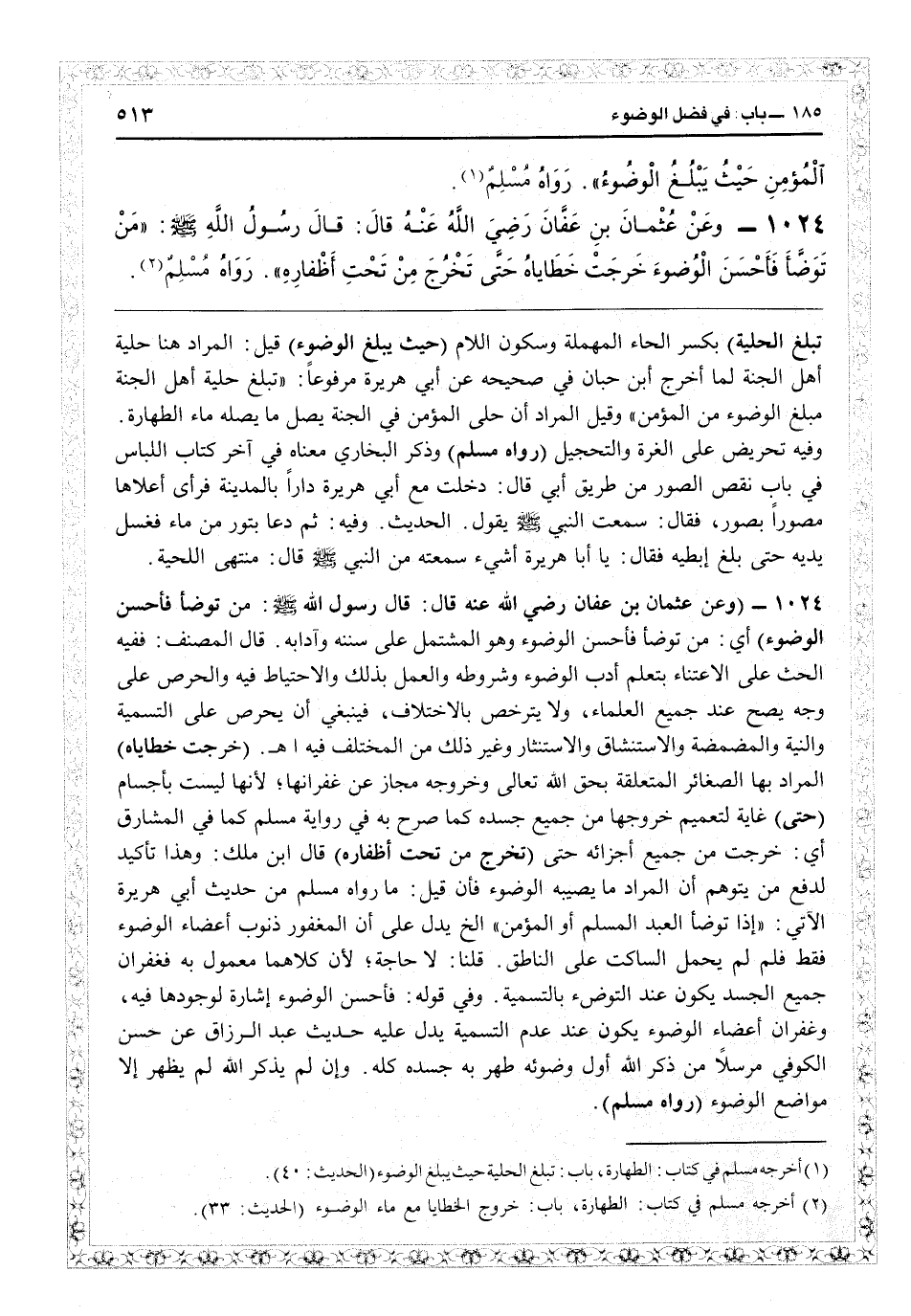 تبلغ الحلية) بكسر الحاء المهملة وسكون اللام (حيث يبلغ الوضوء) قيل المراد هنا حلية أهل الجنة لما أخرج ابن حبان في «صحيحه» عن أبي هريرة مرفوعاً «تبلغ حلية أهل الجنة مبلغ الوضوء من المؤمن» وقيل المراد أن حلي المؤمن في الجنة يصل ما يصله ماء الطهارة، وفيه تحريض على الغرة والتحجيل (رواه مسلم) وذكر البخاري معناه في آخر كتاب اللباس في باب نقص الصور من طريق أبي قال: دخلت مع أبي هريرة داراً بالمدينة فرأى أعلاها مصوراً بصور فقال: سمعت النبي - صلى الله عليه وسلم - يقول الحديث. وفيه «ثم دعا بتور من ماء فغسل يديه حتى بلغ إبطيه فقال: يا أبا هريرة أشيء سمعته من النبي؟ قال منتهى اللحية» .