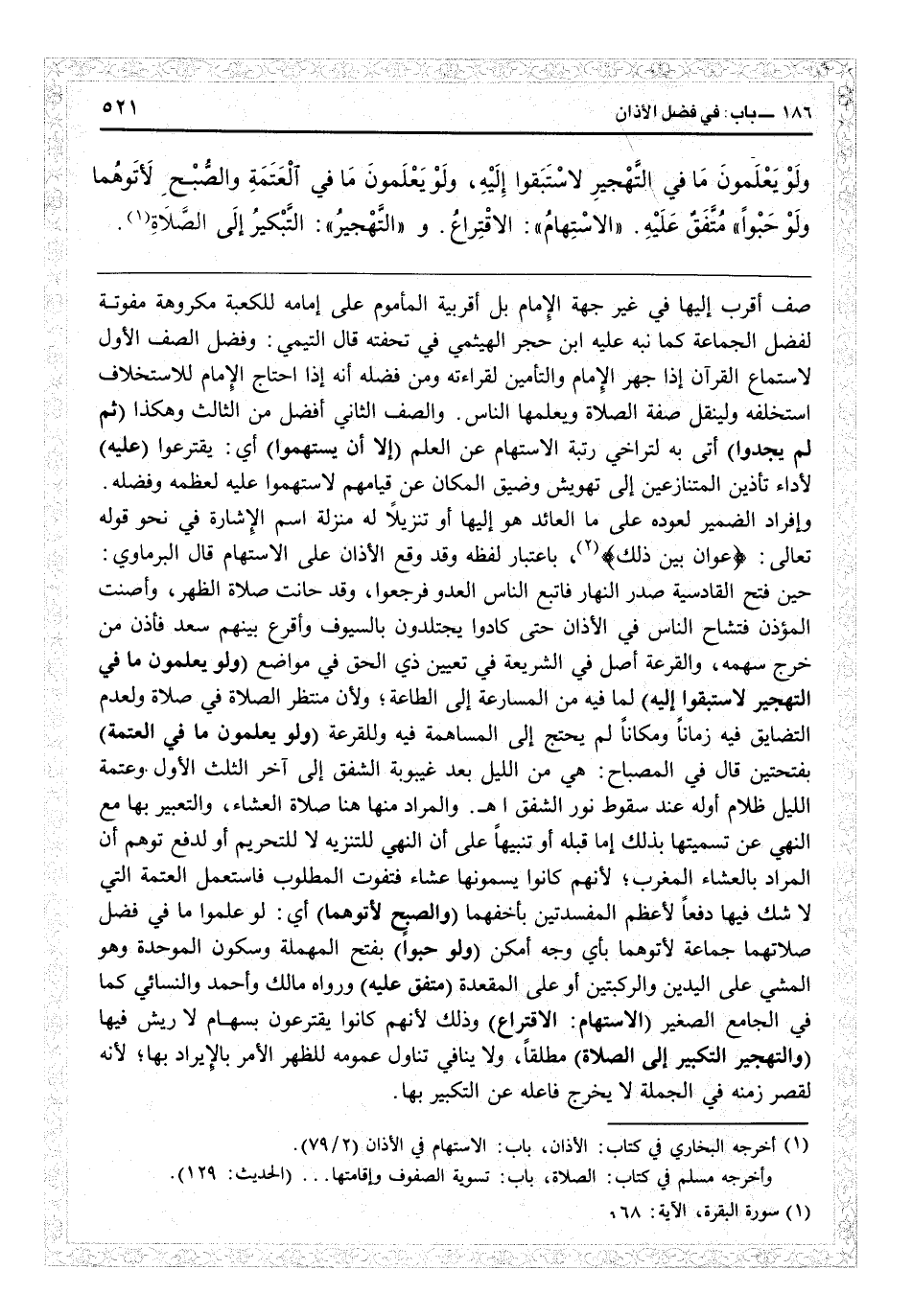 وفضل الصف الأول لاستماع القرآن إذا جهر الإمام والتأمين لقراءته، ومن فضله أنه إذا احتاج الإمام للاستخلاف استخلفه ولينقل صفة الصلاة ويعلمها الناس، والصف الثاني أفضل من الثالث وهكذا (ثم لم يجدوا) أتى به لتراخي رتبة الاتهام عن العلم (إلا أن يستهموا) أي يقترعوا (عليه) لأداء تأذين المتنازعين إلى تهويش وضيق المكان عن قيامهم لاستهموا عليه لعظمه وفضله، وإفراد الضمير لعوده على «ما» العائد هو إليها أو تنزيلاً له منزله اسم الإشارة في نحو قوله تعالى: {عوان بين ذلك} (البقرة: 68) باعتبار لفظه، وقد وقع الأذان على الاستهام: قال البرماوي: حين فتح القادسية صدر النهار فاتبع الناس العدو فرجعوا وقد حانت صلاة الظهر وأصنت المؤذن، فتشاحّ الناس في الأذان حتى كادوا يجتلدون بالسيوف، وأقرع بينهم سعد فأذن من خرج سهمه. والقرعة أصل في الشريعة في تعيين ذي الحق في مواضع (ولو يعلمون ما في التهجير لاستبقوا إليه) لما فيه من المسارعة إلى الطاعة ولأن منتظر الصلاة في صلاة ولعدم التضايق فيه زماناً ومكاناً لم يحتج إلى المساهمة فيه وللقرعة (ولو يعلمون ما في العتمة) بفتحتين، قال في «المصباح» : هي من الليل بعد غيبوبة الشفق إلى آخر الثلث الأول، وعتمة الليل ظلام أوله عند سقوط نور الشفق اهـ. والمراد منها هنا صلاة العشاء، والتعبير بها مع النهي عن تسميتها بذلك، إما قبله أو تنبيهاً على أن النهي للتنزيه لا للتحريم، أو لدفع توهم أن المراد بالعشاء المغرب لأنهم كانوا يسمونها عشاء فتفوّت المطلوب فاستعمل العتمة التي لا شك فيها دفعاً لأعظم المفسدتين بأخفهما (والصبح لأتوهما) أي لو علموا ما في فضل صلاتهما جماعة لأتوهما بأي وجه أمكن (ولو حبواً) بفتح المهملة وسكون الموحدة، وهو المشي على اليدين والركبتين، أو على المقعدة (متفق عليه) ورواه مالك وأحمد والنسائي كما في «الجامع الصغير» (الاستهام الاقتراع) وذلك لأنهم كانوا يقترعون بسهام لا ريش