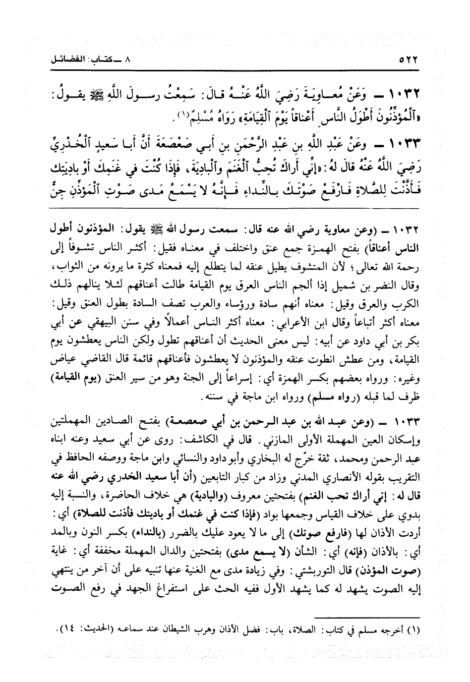 21034 - (وعن معاوية رضي الله عنه قال: سمعت رسول الله يقول: المؤذنون أطول الناس أعناقاً) بفتح الهمزة جمع عنق، واختلف في معناه، فقيل أكثر الناس تشوفاً إلى رحمة الله تعالى لأن المتشوف يطيل عنقه لما يتطلع إليه، فمعناه كثرة ما يرونه من الثواب. وقال النضر بن شميل: إذا ألجم الناس العرق يوم القيامة طالت أعناقهم لئلا ينالهم ذلك الكرب والعرق، وقيل معناه: إنهم سادة ورؤساء، والعرب تصف السادة بطول العنق: وقيل معناه: أكثر أتباعاً. وقال ابن الأعرابي: معناه أكثر الناس أعمالاً، وفي سنن البيهقي عن أبي بكر بن أبي داود عن أبيه: ليس معنى الحديث أن أعناقهم تطول ولكن الناس يعطشون يوم القيامة ومن عطش انطوت عنقه والمؤذنون لا يعطشون فأعناقهم قائمة. قال القاضي عياض وغيره: ورواه بعضهم بكسر الهمزة: أي إسراعاً إلى الجنة وهو من سير العنق (يوم القيامة) ظرف لما قبله (رواه مسلم) ورواه ابن ماجه في «سننه» .