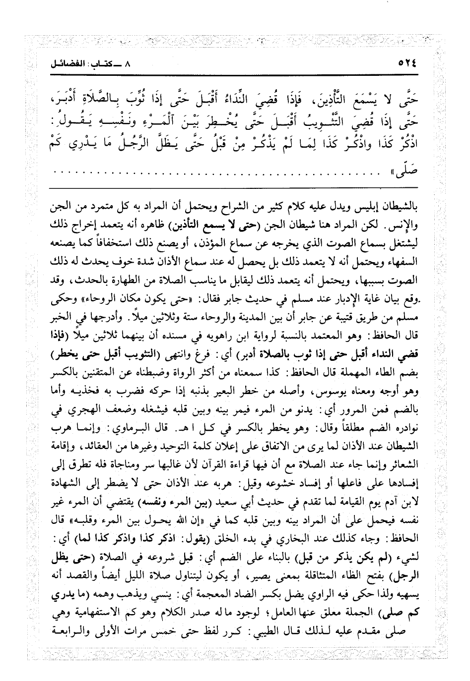 بالشيطان إبليس ويدل عليه كلام كثير من الشراح، ويحتمل أن المراد به كل متمرد من الجن والإنس لكن المراد هنا شيطان الجن (حتى لا يسمع التأذين) ظاهره أنه يتعمد إخراج ذلك ليشتغل بسماع الصوت الذي يخرجه عن سماع المؤذن أو يصنع ذلك استخفافاً كما يصنعه السفهاء، ويحتمل أنه يتعمد ذلك بل يحصل له عند سماع الأذان شدة خوف يحدث له ذلك الصوت بسببها، ويحتمل أنه يتعمد ذلك ليقابل ما يناسب الصلاة من الطهارة بالحدث، وقد وقع بيان غاية الإدبار عند مسلم في حديث جابر فقال «حتى يكون مكان الروحاء» وحكى مسلم من طريق قتيبة عن جابر أن بين المدينة والروحاء ستة وثلاثين ميلاً. وأدرجها في الخبر قال الحافظ: وهو المعتمد بالنسبة لرواية ابن