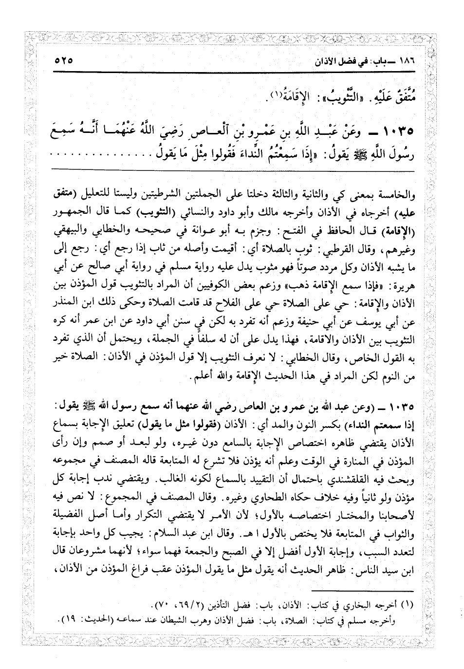 51037 - (وعن عبد الله بن عمرو بن العاص رضي الله عنهما أنه سمع رسول الله يقول: إذا سمعتم النداء) بكسر النون والمد: أي الأذان (فقولوا مثل ما يقول) تعليق الإجابة بسماع الأذان يقتضي ظاهره اختصاص الإجابة بالسامع دون غيره ولو لبعد أو صمم، وإن رأى المؤذن في المنارة في الوقت وعلم أنه يؤذن فلا تشرع له المتابعة، قاله المصنف في مجموعه، وبحث فيه القلقشندي باحتمال أن التقييد بالسماع لكونه الغالب. ويقتضي ندب إجابة كل مؤذن ولو ثانياً، وفيه خلاف حكاه الطحاوي وغيره، وقال المصنف المجموع: لا نص فيه لأصحابنا، والمختار اختصاصه بالأول لأن الأمر لا يقتضي التكرار، وأما أصل الفضيلة والثواب في المتابعة فلا يختص بالأول اهـ. وقال ابن عبد السلام: يجيب كل واحد بإجابة لتعدد السبب، وإجابة الأول أفضل إلا في الصبح والجمعة فهما سواء لأنهما مشروعان قال ابن سيد الناس: ظاهر الحديث أنه يقول مثل ما يقول المؤذن عقب فراغ المؤذن من الأذان،