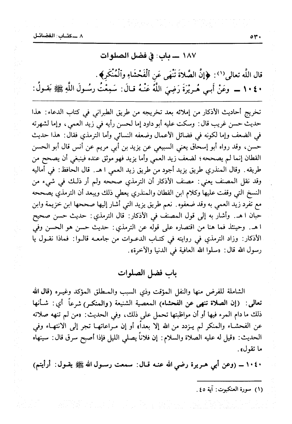 الشاملة للفرض منها والنفل المؤقت وذي السبب والمطلق المؤكد وغيره (قال الله تعالى: إن الصلاة تنهى عن الفحشاء) المعصية الشنيعة (والمنكر) شرعاً: أي شأنها ذلك ما دام المرء فيها أو أن مواظتبها تحمل على ذلك، وفي الحديث «من لم تنهه صلاته عن الفحشاء والمنكر لم يزدد من الله إلا بعداً» أو أن مراعاتها تجر إلى الانتهاء وفي الحديث «قيل له عليه الصلاة والسلام إن فلاناً يصلي الليل فإذا أصبح سرق، قال: سينهاه ما تقول» .