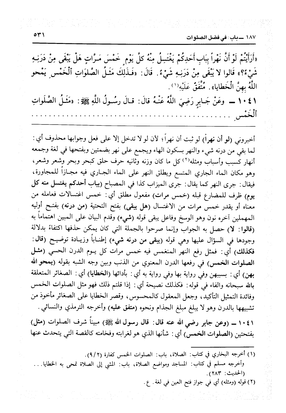 أخبروني (لو أن نهراً) لو ثبت أن نهراً لأن لولا تدخل إلا على فعل وجوابها محذوف: أي لما بقي من درته شيء، والنهر بسكون الهاء ويجمع على نهر بضمتين وبفتحها في لغة وجمعه أنهار كسبب وأسباب، ومثله كل ما كان وزنه وثانيه حرف حلق كبحرْ وبحرَ وشعرْ وشعرَ، وهو مكان الماء الجاري المتسع، ويطلق النهر على الماء الجاري فيه مجازاً للمجاورة فيقال جرى النهر كما يقال جرى الميزاب، كذا في «المصباح» (بباب أحدكم يغتسل منه كل يوم) ظرف للمضارع قبله (خمس مرات) مفعول مطلق: أي خمس اغتسالات فعامله من معناه، أو يقدر: خمس مرات من الاغتسال (هل يبقى) بفتح التحتية (من درنه) بفتح أوليه المهملين آخره نون وهو الوسخ وفاعل يبقى قوله (شيء) وقدم البيان على المبين اهتماماً به (قالوا لا) حصل به الجواب وإنما صرحوا بالجملة التي كان يمكن حذفها اكتفاء بدلالة وجودها في السؤال عليها وهي قولهم (يبقى من درنه شيء) إطناباً وزيادة توضيح (قال فكذلك) أي فمثل رفع النهر المنغمس فيه خمس مرات كل يوم الدرن الحسي (مثل الصلوات الخمس) في رفعها الدرن المعنوي من الذنب، وبين وجه الشبه بقوله (يمحو الله بهن) أي بسببهن، وفي رواية بها، وفي رواية به: أي بأدائها (الخطايا) أي الصغائر المتعلقة بالله سبحانه والفاء في قوله فكذلك فصيحة: أي إذا قلتم ذلك فهو مثل الصلوات الخمس وفائدة التمثيل التأكيد وجعل المعقول كالمحسوس وقصر الخطايا على الصغائر مأخوذ من تشبيهها بالدرن وهو لا يبلغ مبلغ الجذام ونحوه (متفق عليه) وأخرجه الترمذي والنسائي.