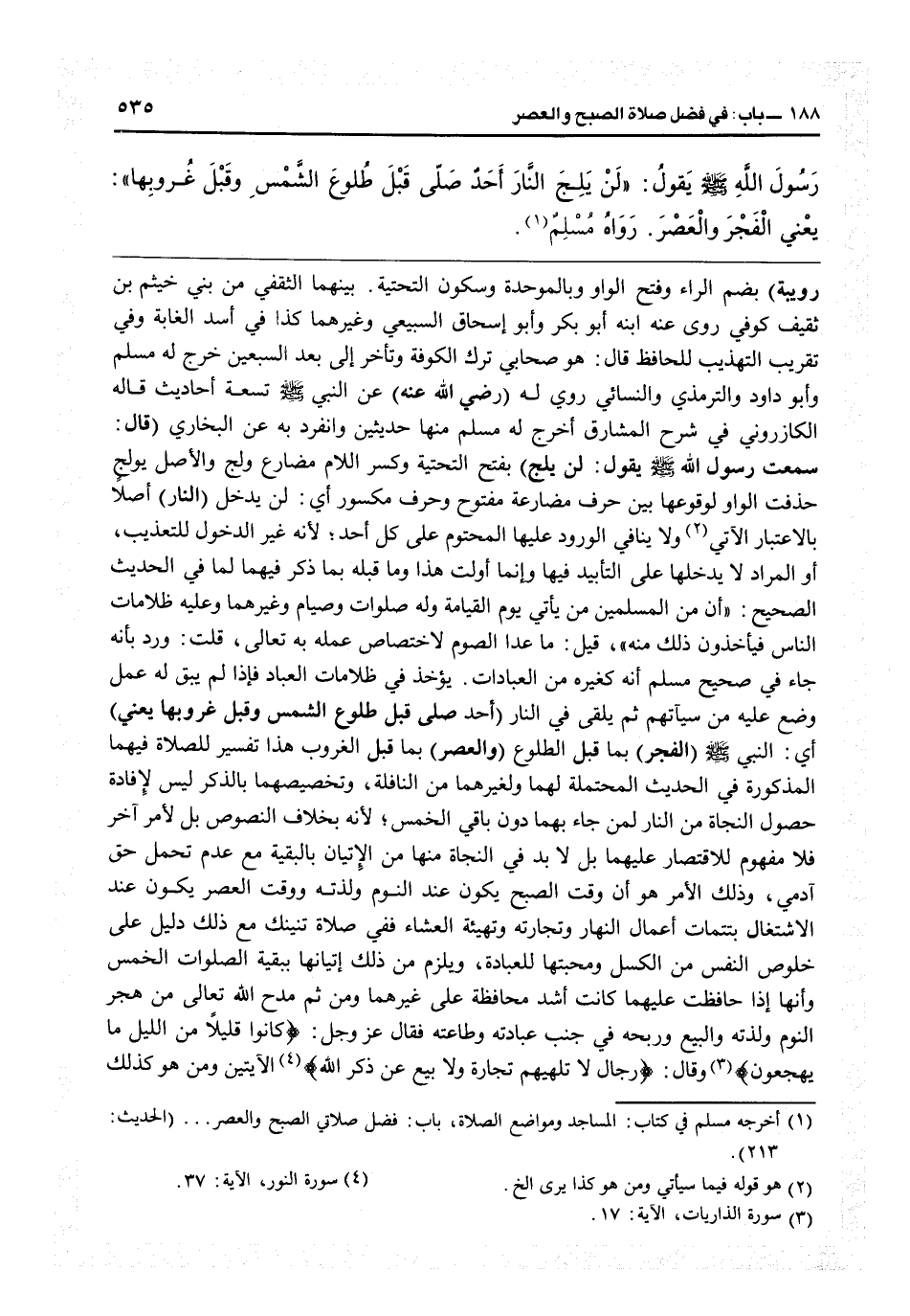 رؤيبة) بضم الراء وفتح الواو وبالموحدة وسكون التحتية بينهما، الثقفي من بني خيثم بن ثقيف كوفي، روى عنه ابنه أبو بكر وأبو إسحاق السبيعي وغيرهما، كذا في «أسد الغابة» ، وفي «تقريب التهذيب» للحافظ قال: هو صحابي نزل الكوفة وتأخر إلى بعد السبعين. خرّج له مسلم وأبو داود والترمذي والنسائي، روي له (رضي الله عنه) عن النبي تسعة أحاديث، قاله الكازروني في «شرح المشارق» ، أخرج له مسلم منها حديثين وانفرد به عن البخاري (قال: سمعت رسول الله يقول: لن يلج) بفتح التحتية وكسر اللام مضارع ولج والأصل يولج حذفت الواو لوقوعها بين حرف مضارعة مفتوح وحرف مكسور: أي لن يدخل (النار) أصلاً بالاعتبار الآتي. ولا ينافي الورود عليها المحتوم على كل أحد لأنه غير الدخول للتعذيب، أو المراد لا يدخلها على التأبيد فيها، وإنما أولت هذا وما قبله بما ذكر فيهما لما في الحديث الصحيح «إن من المسلمين من يأتي يوم القيامة وله صلوات وصيام وغيرهما وعليه ظلامات الناس فيأخذون ذلك منه» قيل ما عدا الصوم لاختصاص عمله به تعالى. قلت: وردّ بأنه جاء في صحيح مسلم «أنه كغيره من العبادات يؤخذ في ظلامات العباد، فإذا لم يبق له عمل وضع عليه من سيائتهم ثم يلقى في النار» (أحد صلى قبل طلوع الشمس وقبل غروبها: يعني) أي النبي (الفجر) بما قبل الطلوع (والعصر) بما قبل الغروب، هذا تفسير للصلاة فيهما المذكورة في الحديث المحتملة لهما ولغيرهما من النافلة، وتخصيصهما بالذكر ليس لإفادة حصول النجاة من النار لمن جاء بهما دون باقي الخمس لأنه بخلاف المنصوص، بل لأمر آخر فلا مفهوم للاقتصار عليهما، بل لا بد في النجاة منها من الإتيان بالبقية مع عدم تحمل حق آدمي، وذلك الأمر هو أن وقت الصبح يكون عند