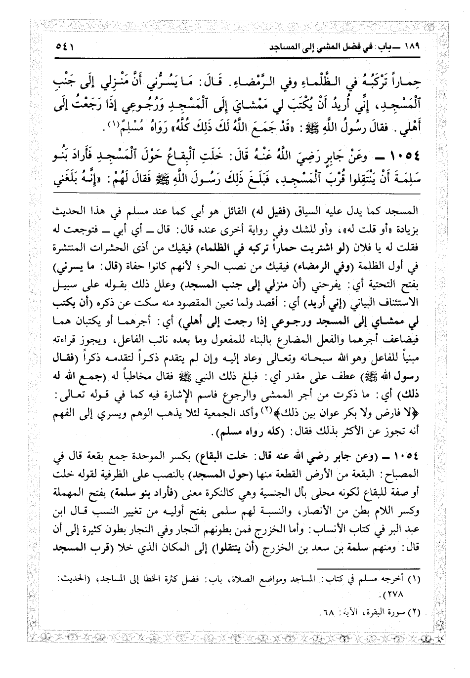 المسجد كما يدل عليه السياق (فقيل له) القائل هو أبيّ كما عند مسلم في هذا الحديث بزيادة «أو قلت له» وأو للشك، وفي رواية أخرى عنده قال: قال أي أبيّ، فتوجهت له فقلت يا فلان (لو اشتريت حماراً تركبه في الظلماء) فيقيك من أذى الحشرات المنتشرة في أوّل الظلمة (وفي الرمضاء) فيقيك من نصب الحر لأنهم كانوا حفاة (قال ما يسرني) بفتح التحتية: أي يفرحني (أن منزلي إلى جنب المسجد) وعلل ذلك بقوله على سبيل الاستئناف البياني (إني أريد) أي أقصد ولما تعين المقصود منه سكت عن ذكره (أن يكتب لي ممشاي إلى المسجد ورجوعي إذا رجعت إلى أهلي) أي أجرهما أو يكتبان هما فيضاعف أجرهما والفعل المضارع بالبناء للمفعول وما بعده نائب الفاعل، ويجوز قراءته مبنيا للفاعل وهو الله سبحانه وتعالى وعاد إليه، وإن لم يتقدم ذكراً (فقال رسول الله) عطف على مقدر: أي فبلغ ذلك النبيّ فقال مخاطباً له (جمع الله لك ذلك) أي ما ذكرت من أجر المشي والرجوع، فاسم الإشارة فيه كهو في قوله تعالى: {لا فارض ولا بكر عوان بين ذلك} (البقرة: 68) وأكد الجمعية لئلا يذهب الوهم ويسري إلى الفهم أنه تجوز عن الأكثر بذلك فقال (كله) (رواه مسلم) .