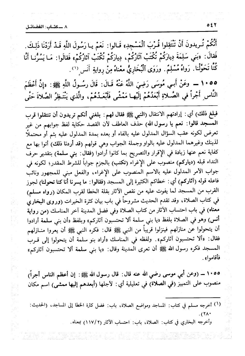 (فبلغ ذلك) أي إرادتهم الانتقال (النبي فقال لهم: بلغني أنكم تريدون أن تنتقلوا قرب المسجد؟ قالوا نعم يا رسول الله) حذف العاطف لأن القصد حكاية لفظ جوابهم من غير تعرض لكونه عقب السؤال المدلول عليه بالفاء أو بعده بمدة المدلول عليه بثم، أو محتملاً لدينك وغيرهما المدلول عليه بالواو، وجملة الجواب وهي قولهم (قد أردنا ذلك) أتوا بها مع كفاية نعم عنها زيادة في الإقرار والتصريح بما كانوا أرادوا (فقال: بني سلمة) بتقدير حرف النداء قبله (دياركم) منصوب على الإغراء (تكتب) بالجزم جواباً للشرط المقدر لكونه في جواب الأمر المدلول عليه بالاسم المنصوب على الإغراء، والفعل مبني للمجهول ونائب فاعله قوله (آثاركم) أي خطاكم الكثيرة إلى المسجد (فقالوا: ما يسرنا أنا كنا تحولنا) لحوز القرب من المسجد لما يفوت عليه من نقص الآثار بقلة الخطا لقرب المكان (رواه مسلم) في كتاب الصلاة، وقد تقدم الحديث مشروحاً في باب بيان كثرة الخيرات (وروى البخاري معناه) في باب احتساب الآثار من كتاب الصلاة وفي فضل المدينة آخر المناسك (من رواية أنس) وهو في الصلاة بلفظ «يا بني سلمة ألا تحتسبون آثاركم» وبلفظ «إن بني سلمة أرادوا أن يتحولوا عن منازلهم فينزلون قريباً من النبي، قال: فكره النبي أن يعروا منازلهم فقال: ألا تحتسبون آثاركم» ولفظه في المناسك