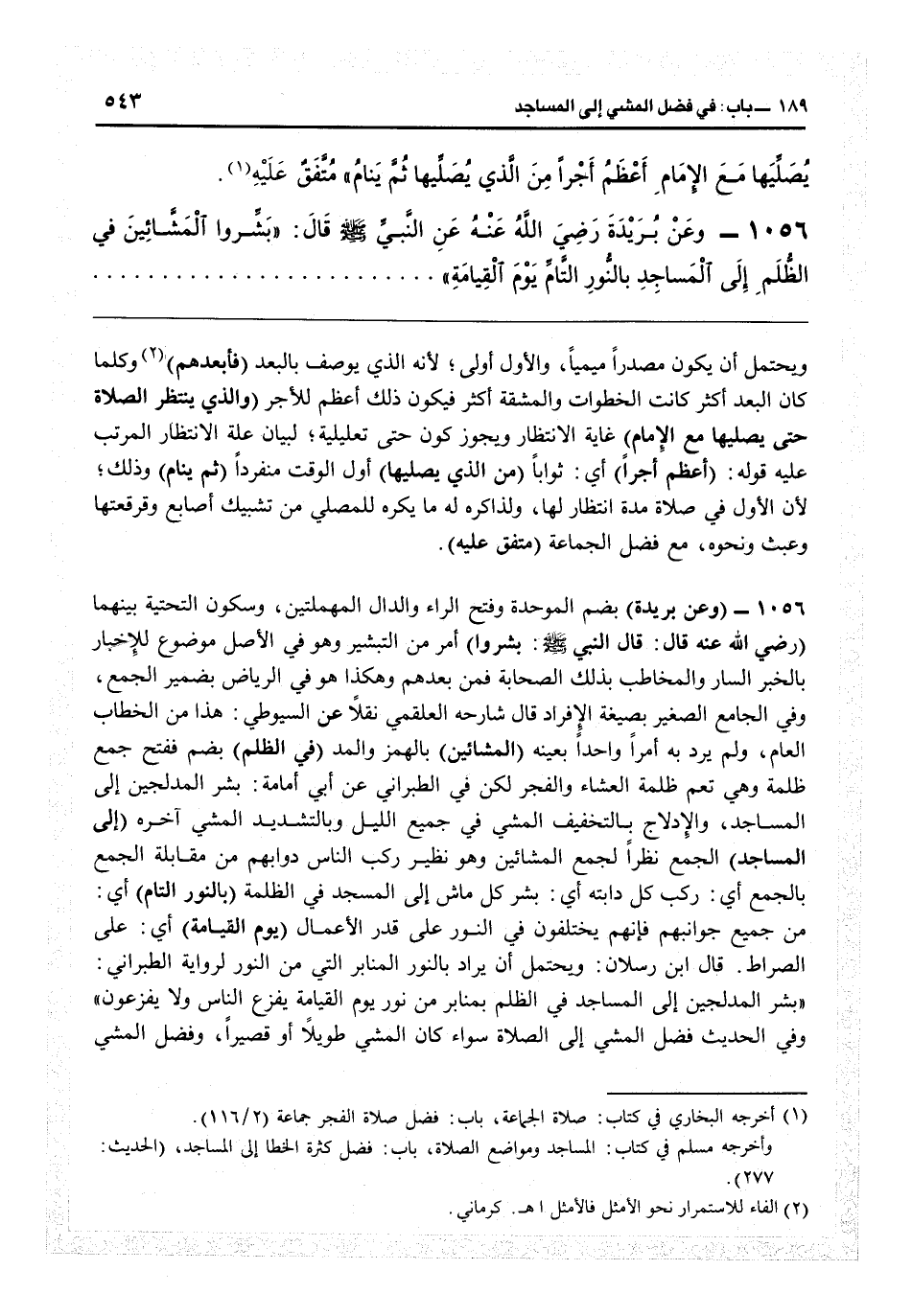 61058 - (وعن بريدة) بضم الموحدة وفتح الراء والدال المهملتين وسكون التحتية بينهما (رضي الله عنه قال: قال النبي: بشروا) أمر من التبشير وهو في الأصل موضوع للإخبار بالخبر السار، والمخاطب بذلك الصحابة فمن بعدهم، وهكذا هو في الرياض بضمير الجمع، وفي «الجامع الصغير» بصيغة الإفراد، قال شارحه العلقمي نقلاً عن السيوطي: هذا من الخطاب العام ولم يرد به أمر واحد بعينه (المشائين) بالهمز والمد (في الظلم) بضم ففتح جمع ظلمة وهي تعم ظلمة العشاء والفجرلكن في الطبراني عن أبي أمامة «بشر المدلجين إلى المساجد» والإدلاج بالتخفيف المشي جميع الليل، وبالتشديد المشي آخره (إلى المساجد) الجمع نظراً لجمع المشائين وهو نظير ركب الناس دوابهم من مقابلة الجمع بالجمع: أي ركب كل دابته: أي بشر كل ماش إلى المسجد في الظلمة (بالنور التام) أي من جميع جوانبهم فإنهم يختلفون في النور على قدر الأعمال (يوم القيامة) أي على الصراط. قال ابن رسلان: ويحتمل أن يراد بالنور المنابر التي من النور لرواية الطبراني «بشر المدلجين إلى المساجد في الظلم بمنابر من نور يوم القيامة، يفزع الناس ولا يفزعون» وفي الحديث: فضل المشي إلى الصلاة سواء كان المشي طويلاً أو قصيراً، وفضل المشي
