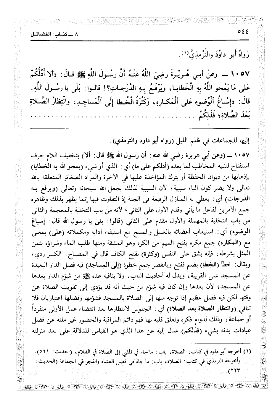 71059 - (وعن أبي هريرة رضي الله عنه، أن رسول الله قال: ألا) بتخفيف اللام حرف استفتاح لتنبيه المخاطب لما بعده (أدلكم على ما) أي الذي أو شيء (يمحو الله به الخطايا) بإذهابها من ديوان الحفظة أو بترك المؤاخذة عليها في الآخرة، والمراد الصغائر المتعلقة بالله تعالى، ولا يضر كون الباء سببية لأن السببية لذلك يجعل الله سبحانه وتعالى (ويرفع به الدرجات) أي يعطي به المنازل الرفيعة في الجنة، إذ التفاوت فيها إنما يظهر بذلك وظاهره جمع الأمرين لفاعل ما يأتي، وقدم الأول على الثاني لأنه من باب التخلية بالمعجمة، والثاني من باب التحلية بالمهملة، والأول مقدم على الثاني (قالوا: بلى يا رسول الله، قال: إسباغ الوضوء) أي استيعاب أعضائه بالغسل والمسح مع استيفاء آدابه ومكملاته (على) بمعنى مع (المكاره) جمع مكره بفتح الميم من الكره وهو المشقة، ومنها طلب الماء وشراؤه بثمن المثل بشرطه فإنه يشق على النفس (وكثرة) بفتح الكاف قال في «المصباح» الكسر رديء ويقال خطأ (الخطأ) بضم ففتح وبالقصر جمع خطوة (إلى المساجد) فيه فضل الدار البعيد عن المسجد على القريبة ويدل له أحاديث الباب، ولا ينافيه عده «من شؤم الدار بعدها عن المسجد» لأن بعدها وإن كان فيه شؤم من حيث إنه قد يؤدي إلى تفويت الصلاة عن وقتها لكن فيه فضل عظيم إذا توجه منها إلى الصلاة بالمسجد فشؤمها وفضلها اعتباريان فلا تنافي (وانتظار الصلاة بعد الصلاة) أي الجلوس لانتظارها بعد انقضاء. عمل الأولى منفرداً أو جماعة وذلك لدوام فكره وتعلق قلبه بها، فهو دائم المراقبة والحضور غير ملته عن فضل عبادات بدله بشيء (فذلكم) عدل إليه عن هذا الذي هو القياس للدلالة على بعد منزلته