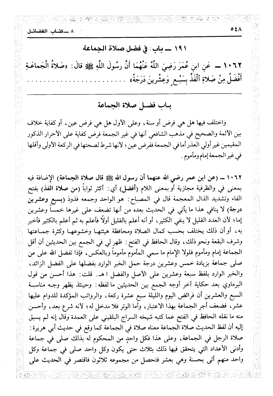 11064 - (وعن ابن عمر رضي الله عنهما أن رسول الله قال: صلاة الجماعة) الإضافة فيه بمعنى في والظرفية مجازية أو بمعنى اللام (أفضل) أي أكثر ثوابا (من صلاة الفذ) بفتح الفاء وتشديد الذال المعجمة، قال في «المصباح» : هو الواحد وجمعه فذوذ (بسبع وعشرين درجة) لا ينافي هذا ما يأتي في الحديث بعده من أنها تضعف على غيرها خمساً وعشرين، إما لأن العدد القليل لا ينفي الكثير أو أنه أعلم بالقليل أولاً فأعلم به ثم أعلم بالكثير فأخبر به، أو أن ذلك يختلف بحسب كمال الصلاة ومحافظة هيئتها وخشوعها وكثرة جماعتها وشرف البقعة ونحو ذلك. وقال الحافظ في «الفتح» : ظهر لي في الجمع بين الحديثين أن أقل الجماعة إمام ومأموم، فلولا الإمام ما سمي المأموم مأموماً وبالعكس، فإذا تفضل الله على من صلى جماعة بزيادة خمس وعشرين درجة حمل الخبر الوارد بفضلها على الفضل الزائد، والخبر الوارد بلفظ سبعة وعشرين على الأصل والفضل اهـ. قلت هذا أحسن من قول البرماوي بعد حكاية ما ذكر في أوجه الجمع بين الحديثين ما لفظه، وحيئذ يظهر وجه مناسبة السبع والعشرين أن فرائض اليوم والليلة سبع عشر ركعة، والرواتب المؤكدة للدوام عليها عشر، فضعف أجر الجماعة بهذا الاعتبار، وأماالوتر فلا مدخل له لأنه شرع بعد ذلك، وأحسن منه ما نقله الحافظ في الفتح عما كتبه شيخه السراج البلقيني على «العمدة» وقال: إنه لم يسبق إليه أن لفظ الحديث صلاة الجماعة معناه صلاة في الجماعة كما وقع في حديث أبي هريرة «صلاة الرجل في الجماعة» وعلى هذا فكل واحد من المحكوم له بذلك صلى في جماعة. وأدنى الأعداد التي يتحقق
