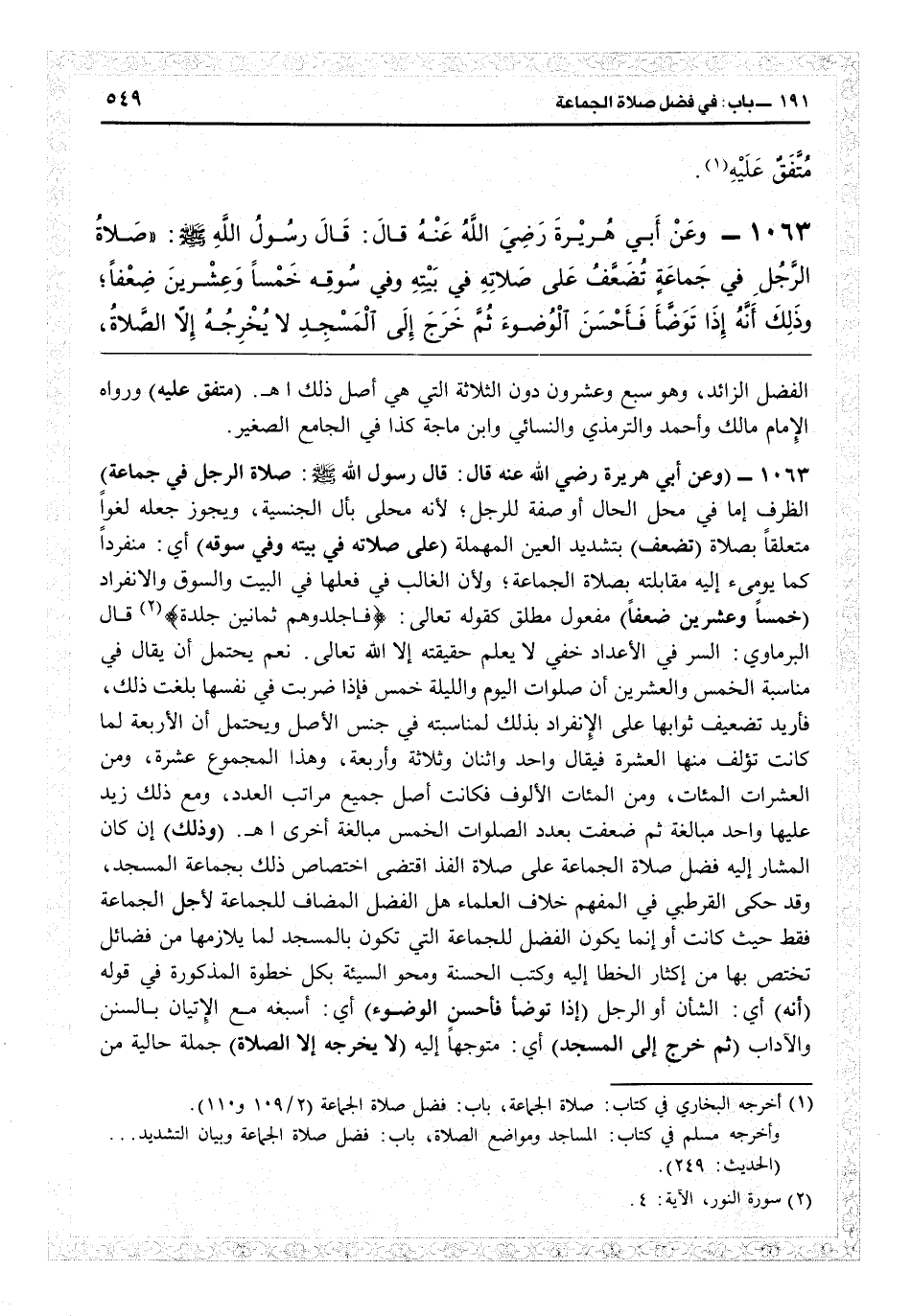 21065 - (وعن أبي هريرة رضي الله عنه قال: قال رسول الله: صلاة الرجل في جماعة) الظرف إما في محل الحال أو الصفة للرجل لأنه محلى بأل الجنسية، ويجوز جعله لغواً متعلقاً بصلاة (تضعف) بتشديد العين المهملة (على صلاته في بيته وفي سوقه) أي منفرداً كما يومىء إليه مقابلته بصلاة الجماعة، ولأن الغالب في فعلها في البيت والسوق الانفراد (خمساً وعشرين ضعفاً) مفعول مطلق كقوله تعالى: {فاجلدوهم ثمانين جلدة} (النور: 4) قال البرماوي: السرّ في الأعداد خفيّ لا يعلم حقيقته إلا الله تعالى، نعم يحتمل أن يقال في مناسبة الخمس والعشرين: إن صلوات اليوم والليلة خمس فإذا ضربت في نفسها بلغت ذلك، فأريد تضعيف ثوابها على الانفراد بذلك لمناسبته في جنس الأصل، ويحتمل أن الأربعة لما كانت تؤلف منها العشرة فيقال واحد واثنان وثلاثة وأربعة وهذا المجموع عشرة ومن العشرات المئات ومن المئات الألوف فكانت أصل جميع مراتب العدد، ومع ذلك زيد عليها واحد مبالغة ثم ضعفت بعدد الصلوات الخمس مبالغة أخرى اهـ. (وذلك) إن كان المشار إليه فضل صلاة الجماعة على صلاة الفذ اقتضى اختصاص ذلك بجماعة المسجد، وقد حكى القرطبي في «المفهم» خلاف العلماء هل الفضل المضاف للجماعة لأجل الجماعة فقط حيث كانت، أو إنما يكون الفضل للجماعة التي تكون بالمسجد لما يلازمها من فضائل تختص بها من إكثار الخطا إليه وكتب الحسنة ومحو السيئة بكل خطوة المذكورة في قوله (إنه) أي الشأن أو الرجل (إذا توضأ فأحسن الوضوء) أي أسبغه مع الإتيان بالسنن والآداب (ثم خرج إلى المسجد) أي