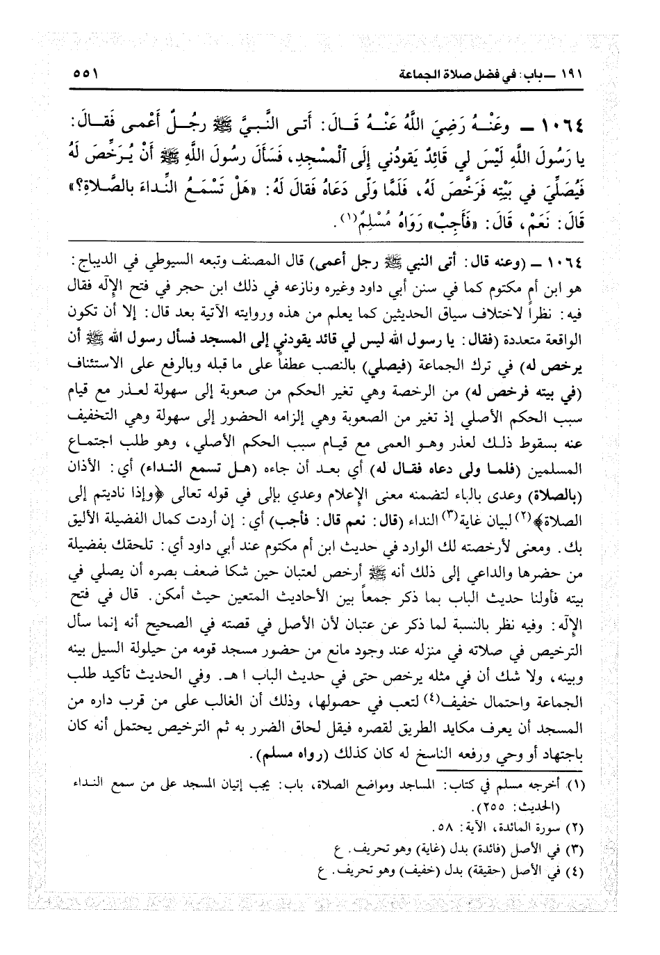 31066 - (وعنه قال: أتى النبيّ رجل أعمى) قال المصنف: وتبعه السيوطي في «الديباج» هو ابن أم مكتوم كما في «سنن أبي داود» وغيره، ونازعه في ذلك ابن حجر في «فتح الإله» فقال فيه لاختلاف سياق الحديثين كما يعلم من هذه وروايته الآتية بعد، قال: إلا أن تكون الواقعة متعددة (فقال: يا رسول الله ليس لي قائد يقودني إلى المسجد، فسأل رسول الله أن يرخص له) في ترك الجماعة (فيصلي) بالنصب عطفاً على ما قبله وبالرعف على الاستئناف (في بيته فرخص له) من الرخصة وهي: تغير الحكم من صعوبة إلى سهولة لعذر مع قيام سبب الحكم الأصلي كتغير الحكم هنا من الصعوبة وهي إلزامه الحضور إلى سهولة، وهي التخفيف عنه بسقوط ذلك لعذر وهو العمى مع قيام سبب الحكم الأصلي وهو طلب اجتماع المسلمين (فلما ولى دعاه فقال له) أي بعد أن جاءه (هل تسمع النداء) أي الأذان (بالصلاة) وعدي بالياء لتضمنه معنى الإعلام وعدي بإلى في قوله تعالى: {وإذا ناديتم إلى الصلاة} (المائدة: 58) لبيان غاية النداء (قال نعم، قال فأجب) أي إن أردت كمال الفضيلة الأليق بك، ومعنى لا رخصة لك الوارد في حديث ابن أم مكتوم عند أبي داود: أي تلحقك بفضيلة من حضرها، والداعي إلى ذلك أنه رخص لعتبان حين شكا ضعف بصره أن يصلي في بيته، فأولنا حديث الباب بما ذكر جمعاً بين الأحاديث المتعين حيث أمكن. قال في «فتح الإله» : وفيه نظر بالنسبة لما ذكر عن عتبان، لأن الأصل في قصته في الصحيح أنه إنما سأل الترخيص في صلاته في منزله عند وجود مانع من حضور مسجد قومه من حيلولة السيل بينه وبينه، ولا شك أن في مثله يرخص حتى في حديث الباب اهـ. وفي الحديث تأكيد طلب الجماعة واحتمال خفيف التعب في حصوله. وذلك أن الغالب على من قرب داره من المسجد أن يعرف مكابد الطريق لقصره فيقل لحاق الضرر به، ثم الترخيص يحتمل أنه كان باجتهاد أو وحي ورفعه الناسخ له كان كذلك (روه مسلم) .