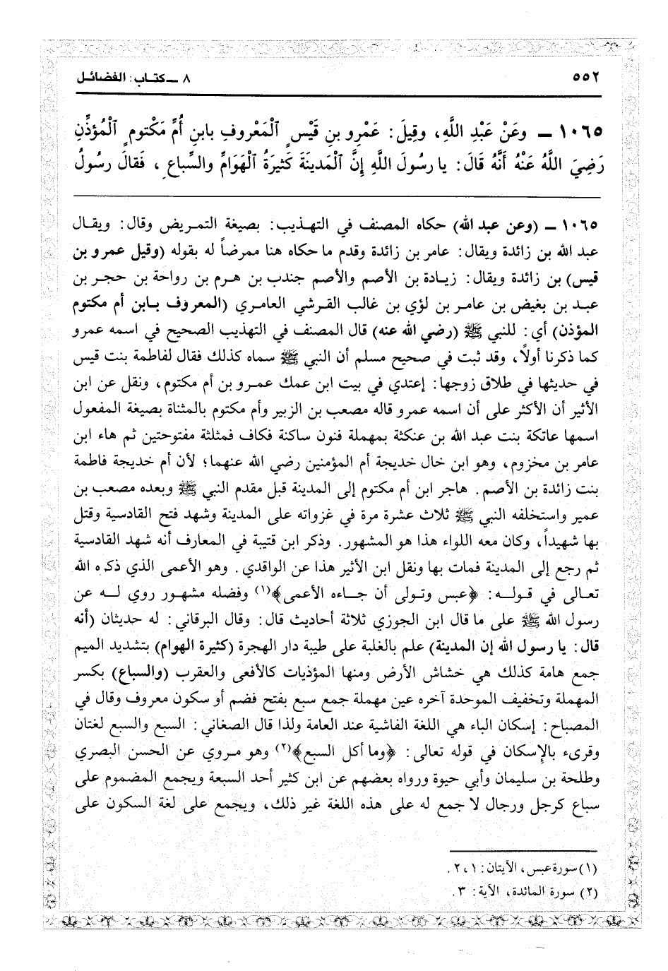 41067 - (وعن عبد الله) حكاه المصنف في «التهذيب» بصيغة التمريض وقال: ويقال عبد الله بن زائدة، ويقال عامر بن زائدة، وقدّم ما حكاه هنا ممرضاً له بقوله (وقيل عمر بن قيس) بن زائدة، ويقال زياد بن الأصم، والأصم جندب بن هرم بن رواحة بن حجر بن عبد بن بغيض بن عامر بن لؤي بن غالب القرشي العامري (المعروف بابن أم مكتوم المؤذن) أي للنبي (رضي الله عنه) قال المصنف في «التهذيب» : الصحيح في اسمه عمرو كما ذكرنا أولاً، وقد ثبت في «صحيح مسلم» أن النبي سماه كذلك فقال لفاطمة بنت قيس في حديثها في طلاق زوجها: «اعتدى في بيت ابن عمك عمرو بن أم مكتوم» ونقل عن ابن الأثير أن الأكثر على أن اسمه عمرو قاله مصعب بن الزبير، وأم مكتوم: بالمثناة بصيغة المفعول اسمها عاتكة بنت عبد الله بن عنكثة بمهملة فنون ساكنة فكاف فمثلثة مفتوحتين ثم هاء: ابن عامر ابن مخزوم وهو ابن خال خديجة أم المؤمنين رضي الله عنهما، لأن أم خديجة فاطمة بنت زائدة بن الأصم. هاجر ابن أم مكتوم إلى المدينة قبل مقدم النبي وبعده مصعب بن عمير، واستخلفه النبي ثلاث عشرة مرة في غزواته على المدينة، وشهد فتح القادسية وقتل بها شهيداً وكان معه اللواء، هذا هو المشهور. وذكر ابن قتيبة في «المعارف» أنه شهد القادسية ثم رجع إلى المدينة فمات بها، ونقل ابن الأثير هذا عن الواقدي، وهو الأعمى الذي ذكره الله تعالى في قوله: {عبس وتولى أن جاءه الأعمى} (عبس: 1، 2) وفضله مشهور، روي له عن رسول الله على ما قال ابن الجوزي ثلاثة أحاديث، قال: وقال البرقاني له حديثان (أنه قال: يا رسول الله إن المدينة) علم بالغلبة على طيبة دار الهجرة (كثيرة الهوام) بتشديد الميم جمع هامة كذلك هي خشاش الأرض ومنها المؤذيات كالأفعى والعقرب (والسباع) بكسر المهملة وتخفيف الموحدة آخر عين مهملة جمع سبع بفتح فضم أو سكون معروف، وقال في «المصباح» إسكان الباء هي اللغة الفاشية عند العامة، ولذا قال