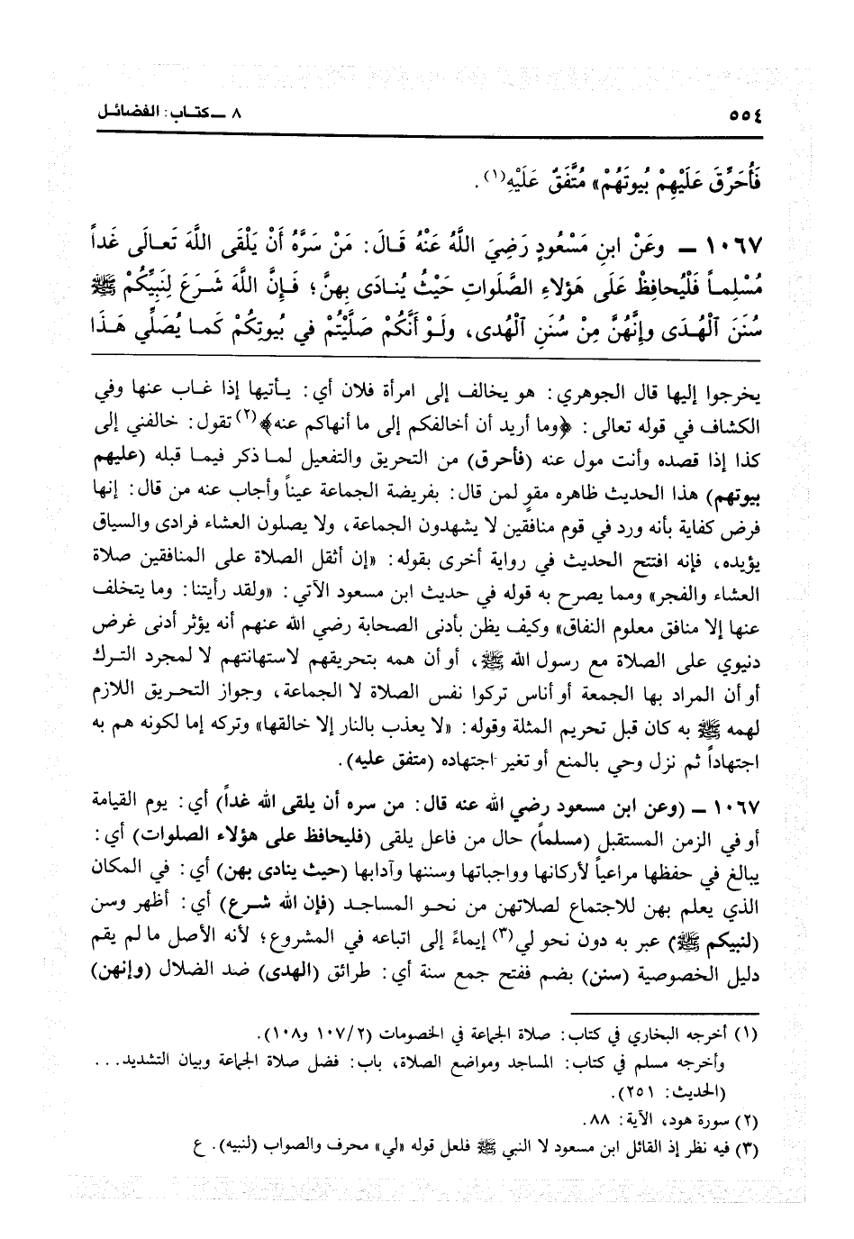 61069 - (وعن ابن مسعود رضي الله عنه قال: من سرّه أن يلقى الله غداً) أي يوم القيامة أو في الزمن المستقبل (مسلماً) حال من فاعل يلقى (فليحافظ على هؤلاء الصلوات) أي يبالغ في حفظها مراعياً لأركانها وواجباتها وسننها وآدابها (حيث ينادى بهن) أي في المكان الذي يعلم بهن للاجتماع لصلاتهن من نحو المساجد (فإن الله شرع) أي أظهر وسن (لنبيكم) عبر به دون نحولي إيماء إلى اتباعه في المشروع لأنه الأصل ما لم يقم دليل الخصوصية (سنن) بضم ففتح جمع سنة: أي طرائق (الهدى) ضد الضلال (وإنهن)