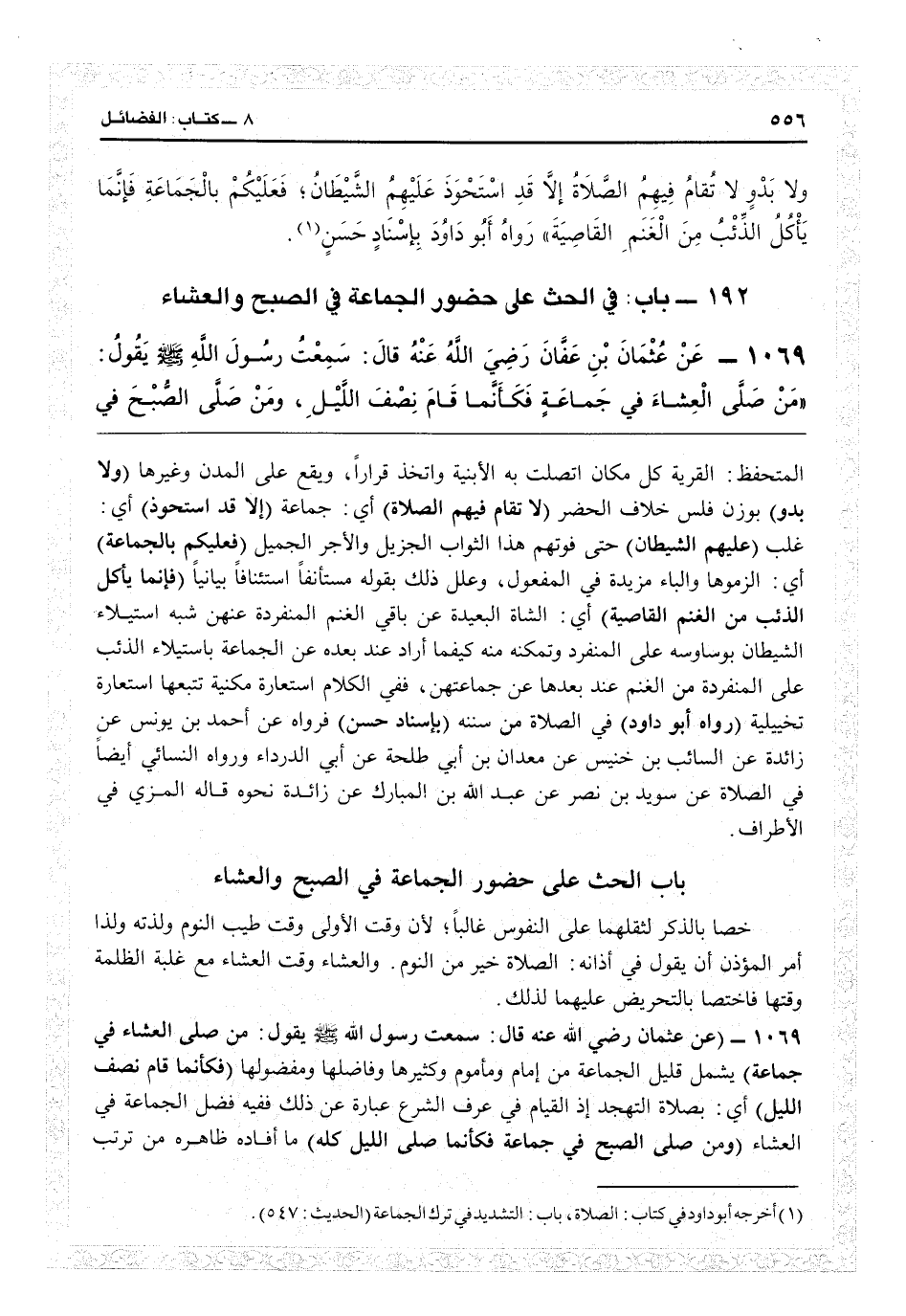المتحفظ: القرية كل مكان اتصلت به الأبنية واتخذ قراراً ويقع على المدن وغيرها (ولا بدو) بوزن فلس خلاف الحضر (لا تقام فيهم الصلاة) أي جماعة (إلا قد استحوذ) أي غلب (عليهم الشيطان) حتى فوّتهم هذا الثواب الجزيل والأجر الجميل (فعليكم بالجماعة) أي الزموها، والباء مزيدة في المفعول وعلل ذلك بقوله مستأنفاً بيانياً (فإنما يأكل الذئب من الغنم القاصية) أي الشاة البعيدة عن باقي الغنم المنفردة عنهن، شبه استيلاء الشيطان بوساوسه على المنفرد وتمكنه منه كيفما أراد عند بعده عن الجماعة باستيلاء الذئب على المنفردة من الغنم عند بعدها عن جماعتهنّ، ففي الكلام استعارة مكنية تتبعها استعارة تخييلية (رواه أبو داود) في الصلاة من «سننه» (بإسناد حسن) فرواه عن أحمد بن يونس عن زائدة عن السائب بن خنيس عن معدان بن أبي طلحة عن أبي الدرداء، ورواه النسائي أيضاً في الصلاة عن سويد بن نصر عن عبد الله بن المبارك عن زائدة نحوه، قاله المزي في «الأطراف» .