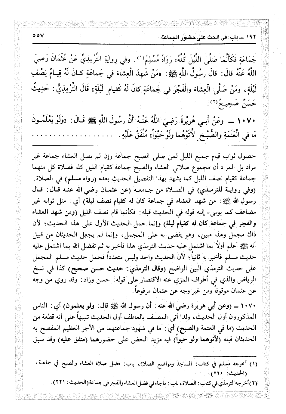 (وفي رواية للترمذي) في الصلاة من «جامعه» (عن عثمان رضي الله عنه قال: قال رسول الله: من شهد العشاء في جماعة كان له كقيام نصف ليلة) أي مثل ثوابه غير مضاعف كما يومىء إليه قوله في الحديث قبله «فكأنما قام نصف الليل» (ومن شهد العشاء والفجر في جماعة كان له كقيام اليلة) وإنما: حمل الحديث الأول على هذا الحديث لأن ذاك مجمل هذا مبين وهو يقضي به على المجمل، وإنما لم يجعل الحديثان من قبيل أنه أعلم أولاً بما اشتمل عليه حديث الترمذي هذا فأخبر به، ثم تفضل الله بما اشتمل عليه حديث مسلم فأخبر به ثانياً لأن الحديث واحد وليس متعدداً، فحمل حديث مسلم المجمل على حديث الترمذي البين الواضح (وقال الترمذي: حديث حسن صحيح) كذا في نسخ «الرياض» . والذي في «أطراف» المزي عنه الاقتصار على قوله حسن، وزاد: وقد روي من وجه عن عثمان موقوفاً ومن غير وجه عن عثمان مرفوعاً.