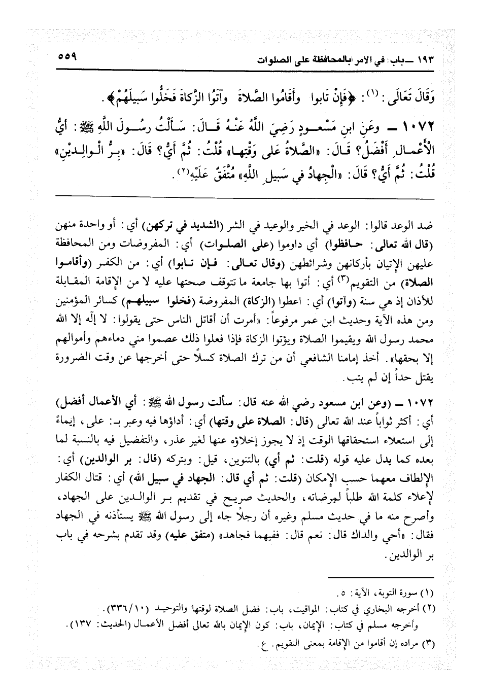 11074 - (وعن ابن مسعود رضي الله عنه قال: سألت رسول الله أي الأعمال أفضل) أي أكثر ثواباً عند الله تعالى (قال الصلاة على وقتها) أي أداؤها فيه، وعبر بعلى إيماء إلى استعلاء استحقاقها الوقت إذ لا يجوز إخلاؤه عنها بغير عذر، والتفضيل فيه بالنسبة لما بعده كما يدل عليه قوله (قلت: ثم أي) بالتنوين قيل وبتركه (قال بر الوالدين) أي الإلطاف معهما حسب الإمكان (قلت: ثم أي) بالتنوين قيل وبتركه (قال بر الوالدين) أي الإلطاف معهما حسب الإمكان (قلت: ثم أي؟ قال: الجهاد في سبيل الله) أي قتال الكفار لإعلاء كلمة الله طلباً لمرضاته، والحديث صريح في تقديم بر الوالدين على الجهاد، وأصرح منه ما في حديث مسلم وغيره «أن رجلا جاء إلى رسول الله يستأدنه في الجهاد فقال: أحيّ والداك؟ قال: نعم، قال: ففيهما فجاهد» (متفق عليه) وقد تقدم بشرحه في باب بر الوالدين.