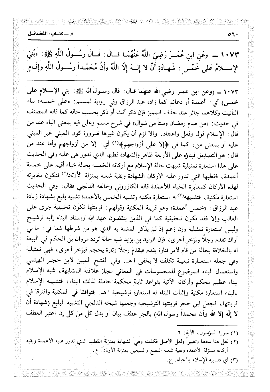 21075 - (وعن ابن عمر رضي الله عنهما قال: قال رسول الله: بني الإسلام على خمس) أي أعمدة أو دعائم كما زاده عبد الرزاق، وفي رواية لمسلم على خمسة بتاء التأنيث وكلاهما جائز عند حذف المميز فإن ذكر أنث أو ذكر بحسب حاله كما قاله المصنف في حديث «من صام رمضان وستاً من شوال» في «شرح مسلم» ، وفعل وعلى فيه بمعنى الباء عند من قال الإسلام قول، ومنه حديث «بني الإسلام على خمس» وفعل واعتقاد، والإلزام أن يكون غيرها ضرورة كون المبني غير المبني عليه أو بمعنى من كما في «إلا على أزواجهم» أي إلا من أزواجهم. وأما عند من قال هو التصديق فبناؤه على الأربعة ظاهر، والشهادة قطبها الذي تدور هي عليه. وفي الحديث على هذا استعارة تمثيلية شبهت حالة الإسلام مع أركانه الخمسة بحالة خباء أقيم على خمسة أعمدة فقطبها التي تدور عليه الأركان وهو الشهادة بمنزلة العمود الذي في وسط الخباء وبقية شعبه بمنزلة الأوتاد، فتكون مغايرته لهذه الأركان كمغايرة الخباء للأعمدة، قاله الكازوني، وخالفه الدلجي فقال: وفي الحديث استعارة مكنية فتشبيهه به استعارة مكنية، وتشبيه الخمس بالأعمدة تشبيه بليغ بشهادة زيادة عبد الرزاق «خمس أعمدة» وهو قرينة المكنية، وقولهم قرينتها تكون تخييلية جرى على الغالب، وإلا فقد تكون تحقيقية كما في {الذين ينقضون عهد الله} () وإسناد البناء إليه ترشيح وليس استعارة تمثيلية وإن زعم، إذ لم يذكر المشبه به الذي هو من شرطها كما في مالي أراك تقدم رجل وتؤخر أخرى. فإن الوليد بن يزيد شبه حال تردد مروان بن الحكم في البيعة له بالخلافة بحالة من قام لأمر فتارة يعزم فيقدم رجلاً وتارة يحجم فيؤخر أخرى فهي تمثيلية، وفي جعله استعارة تبعية تكلف لا يخفى اهـ. وفي «الفتح المبين» لابن حجر الهيتمي: واستعمال البناء الموضوع للمحسوسات في المعاني مجاز علاقته المشابهة، شبه الإسلام ببناء عظيم محكم وأركانه الآتية بقواعد ثابتة محكمة حاملة لذلك