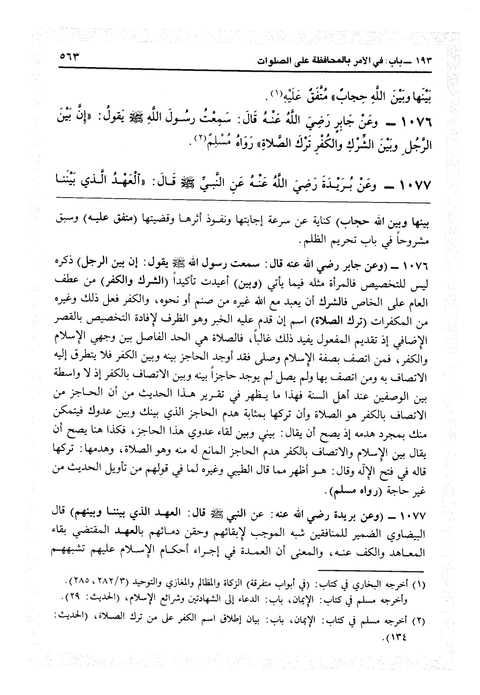 51078 - (وعن جابر رضي الله عنه قال: سمعت رسول الله يقول: إن بين الرجل) ذكر ليس للتخصيص فالمرأة مثله فيما يأتي (وبين) أعيدت تأكيداً (الشرك والكفر) من عطف العام على الخاص، فالشرك أن يعبد مع الله غيره من صنم أو نحوه، والكفر فعل ذلك وغيره من المكفرات (ترك الصلاة) اسم إن قدم عليه الخبر وهو الظرف لإفادة التخصيص والقصر الإضافي، إذ تقديم المعمول يفيد ذلك غالباً، فالصلاة هي الحد الفاصل بين وجهي الإسلام والكفر، فمن اتصف بصفة الإسلام وصلى فقد أوجد الحاجز بينه وبين الكفر فلا يتطرق إليه الاتصاف به، ومن اتصف بها ولم يصل لم يوجد حاجز بينه وبين الاتصاف بالكفر، إذ لا واسطة بين الوصفين عند أهل السنة، فهذا ما يظهر في تقرير هذا الحديث من أن الحاجز من الاتصاف بالكفر هو الصلاة، وأن تركها بمثابة هدم الحاجز الذي بينك وبين عدوك فيتمكن منك بمجرد هدمه، إذ يصح أن يقال بيني وبين لقاء عدوي هذا الحاجز، فكذا هنا يصح أن يقال بين الإسلام والاتصاف بالكفر هدم الحاجز المانع له منه وهو الصلاة وهدمها تركها، قاله في «فتح الإله» وقال: هو أظهر مما قال الطيبي وغيره لما في قولهم من تأويل الحديث من غير حاجة (رواه مسلم) .