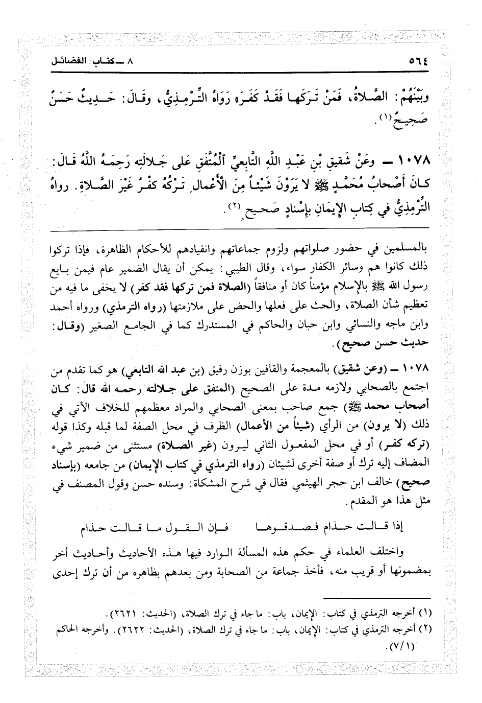 71080 - (وعن شقيق) بالمعجمة والقافين بوزن رفيق (ابن عبد الله التابعي) هو كما تقدم من اجتمع بالصحابي ولازمه مدة على الصحيح (المتفق على جلالته رحمه الله قال: كان أصحاب محمد) جمع صاحب بمعنى الصحابي، والمراد معظمهم للخلاف الآتي في ذلك (لا يرون) من الرأي (شيئاً من الأعمال) الظرف في محل الصفة لما قبله، وكذا قوله (تركه كفر) أو في محل المفعول الثاني ليرون (غير الصلاة) مستثنى من ضمير شيء المضاف إليه ترك أو صفة أخرى لشيئاً (رواه الترمذي في كتاب الإيمان) من «جامعه» (بإسناد صحيح) خالف ابن حجر الهيتمي فقال في «شرح المشكاة» : وسنده حسن، وقول المصنف في مثل هذا هو المقام.