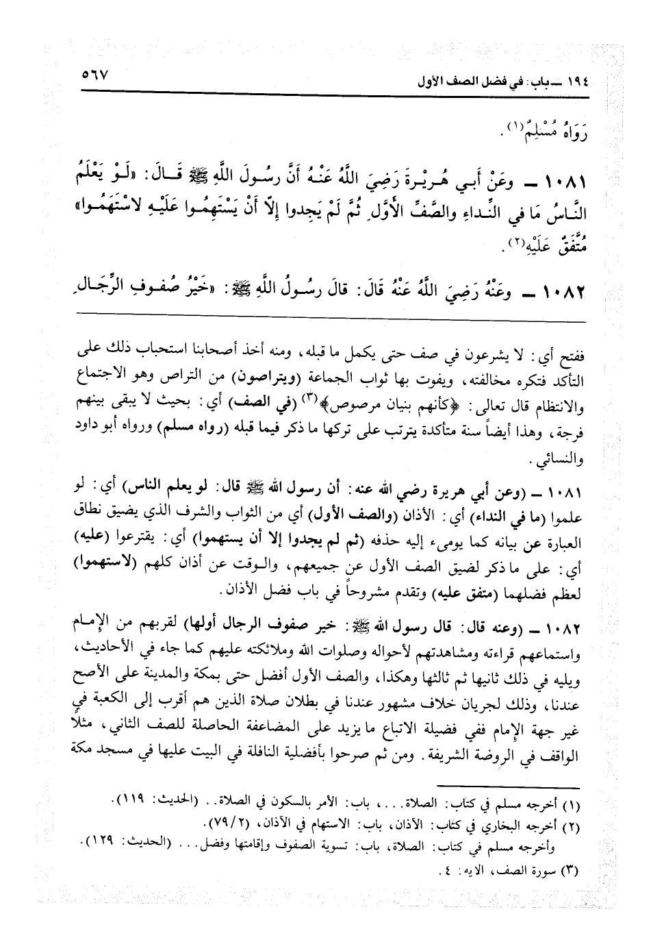 21083 - (وعن أبي هريرة رضي الله عنه أن رسول الله: قال لو يعلم الناس) أي لو علموا (ما في النداء) أي الأذان (والصف الأول) أي من الثواب والشرف الذي يضيق نطاق العبارة عن بيانه كما يومىء إليه حذفه (ثم لم يجدوا إلا أن يستهموا) أي يقترعوا (عليه) أي على ما ذكر لضيق الصف الأول عن جميعهم والوقت عن أذان كلهم (لاستهموا) لعظم فضلهما (متفق عليه) وتقدم مشروحاً في باب فضل الأذان.