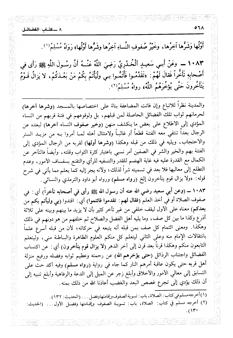 والمدينة نظراً للاتباع وإن فاتت المضاعفة بناء على اختصاصها بالمسجد (وشرها آخرها) لحرمانهم ثواب تلك الفضائل الحاصلة لمن قبلهم، بل لوقوعهم في فتنة قربهم من النساء المؤدي إلى الاطلاع على بعض ما ينكشف منهن (وخير صفوف النساء آخرها) لبعده عن الرجال بعداً تنتفي معه الفتنة قطعا أو غالباً، ولامتثال أهله لما أمروا به من مزيد الستر والاحتجاب، ويليه في ذلك من قبله وهكذا (وشرها أولها) لقربه من الرجال المؤدي إلى الفتنة بهم والخير والشر في الصفين أمر نسبي باعتبار كثرة الثواب وقلته، وأيضاً فالتأخر عن الكمال مع القدرة عليه فيه غاية الهضم للقدر والتسفيه للرأي والتفنع بسفساف الأمور وعدم التطلع إلى معاليها، فلا يعد في تسميته شراً لذلك ولأنه يجر إليه كما يعلم مما يأتي في شرح قوله «ولا يزال قوم يتأخرون» الخ (رواه مسلم) ورواه أبو داود