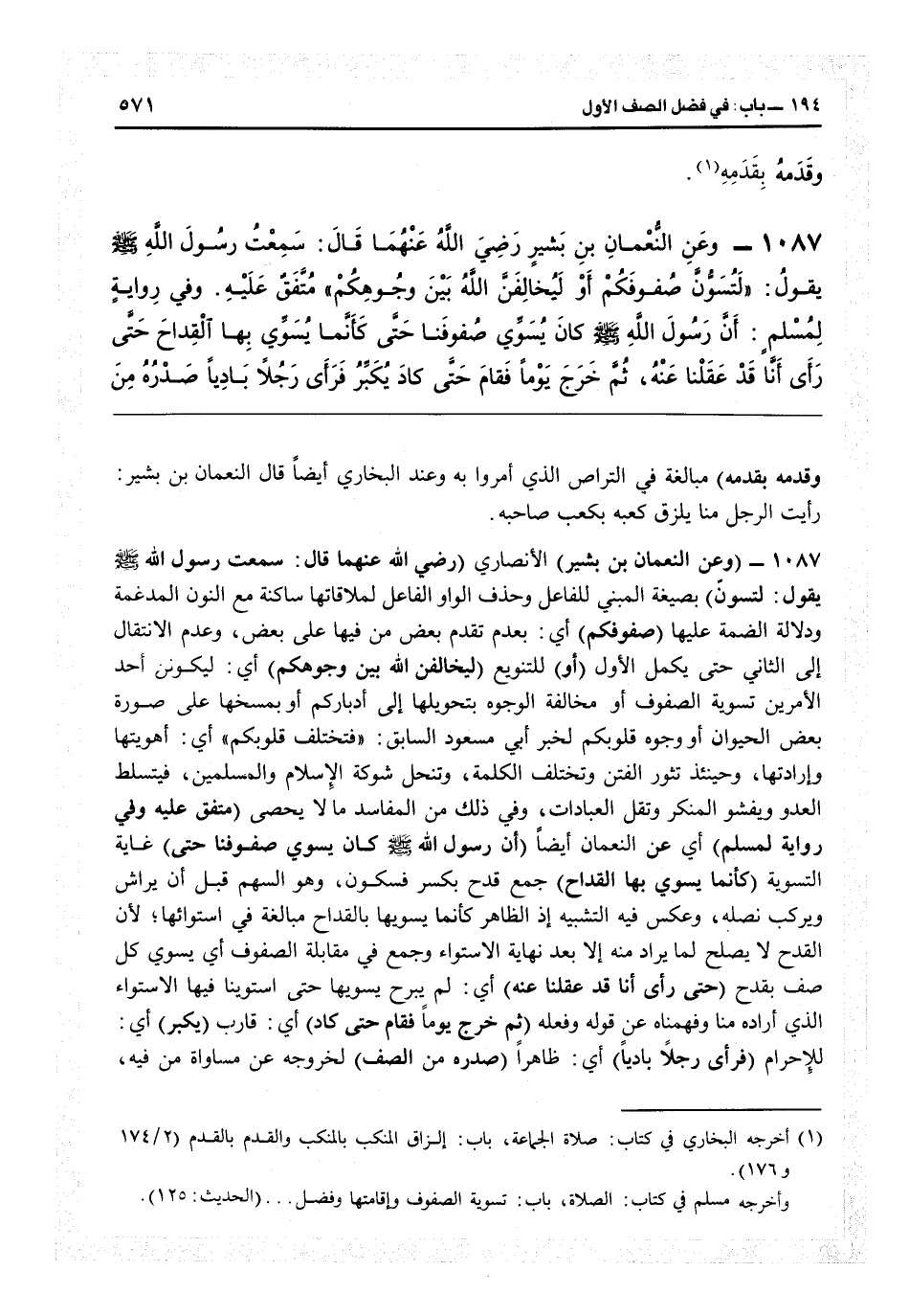 81089 - (وعن النعمان بن بشير) الأنصاري (رضي الله عنهما قال: سمعت رسول الله يقول: لتسوّن) بصيغة المبني للفاعل وحذف الواو الفاعل لملاقاتها ساكنة مع النون المدغمة ودلالة الضمة عليها (صفوفكم) أي بعدم تقدم بعض من فيها على بعض وعدم الانتقال إلى الثاني حتى يكمل الأول (أو) للتنويع (ليخالفنّ الله بين وجوهكم) أي ليكونن أحد الأمرين تسوية الصفوف أو مخالفة الوجوه بتحويلها إلى أدباركم، أو بمسخها على صورة بعض الحيوان أو وجوه قلوبكم الخبر أبي مسعود السابق «فتختلف قلوبكم» أي أهويتها وإرادتها، وحينئذ تثور الفتن وتختلف الكلمة وتنحل شوكة الإسلام والمسلمين فيتسلط العدو ويفشو المنكر وتقل العبادات في ذلك من المفاسد ما لا يحصى (متفق عليه) .