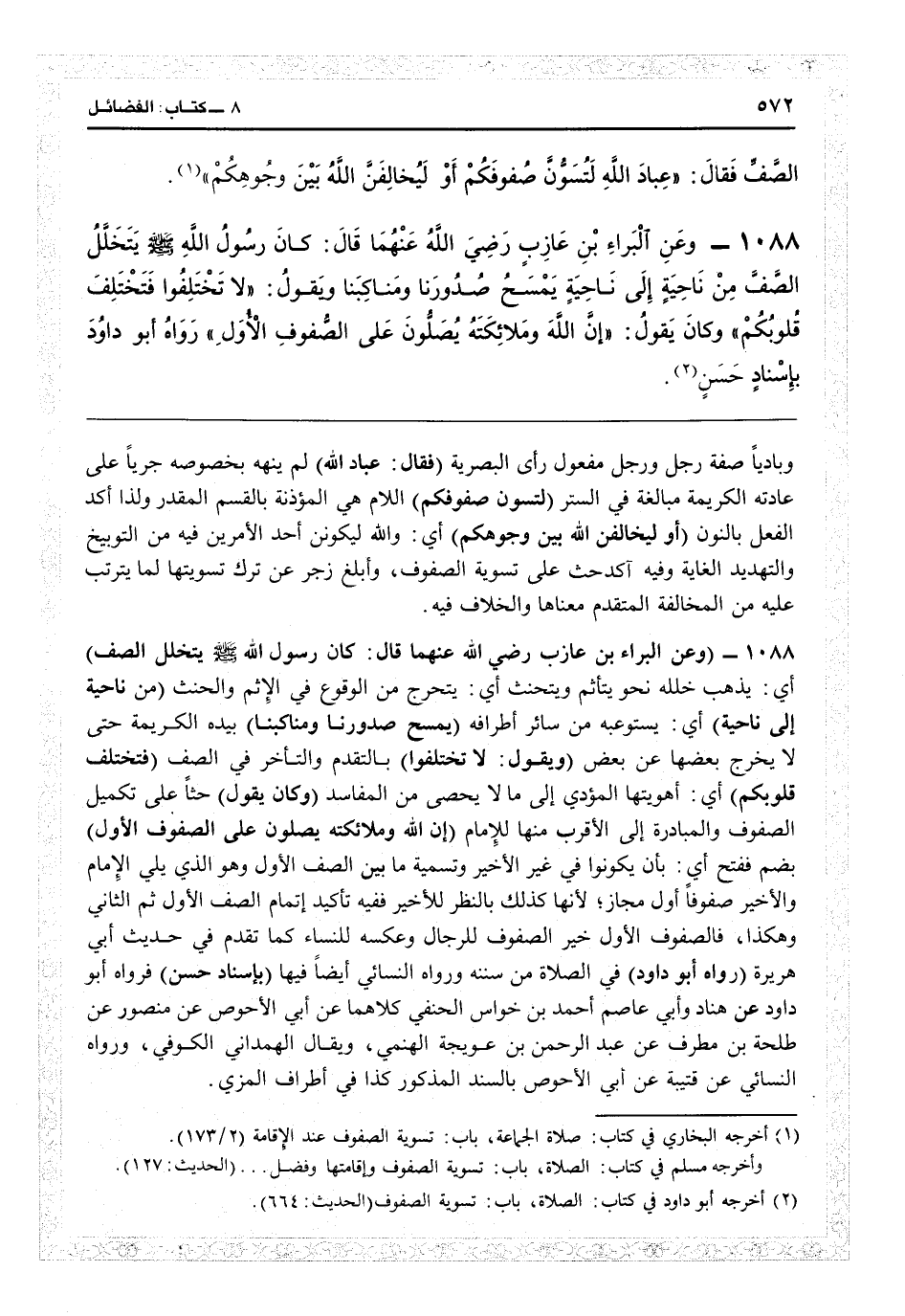 91090 - (وعن البراء بن عازب رضي الله عنهما قال: كان رسول الله يتخلل الصف) أي يذهب خلله نحو يتأثم ويتحنث: أي يتحرج من الوقوع في الإثم والحنث (من ناحية إلى ناحية) أي يستوعبه من سائر أطرافه (يمسح صدورنا ومناكبنا) بيده الكريمة حتى لا يخرج بعضها عن بعض (ويقول لا تختلفوا) بالتقدم والتأخر في الصف (فتختلف قلوبكم) أي أهويتها المؤدي إلى ما لا يحصى من المفاسد (وكان يقول) حثاً على تكميل الصفوف والمبادرة إلى الأقرب منها للإمام (إن الله وملائكته يصلون على الصفوف الأول) بضم ففتح: أي بأن يكونوا في غير الأخير، وتسمية ما بين الصف الأول وهو الذي يلي الإمام والأخير صفوفاً أول مجاز لأنها كذلك بالنظر للأخير. ففيه تأكيد إتمام الصف الأول ثم الثاني وهكذا، فالصفوف الأول خير الصفوف للرجال وعكسه للنساء كما تقدم في حديث أبي هريرة (رواه أبو داود) في الصلاة من «سننه» ورواه النسائي أيضاً فيها (بإسناد حسن) فرواه أبو داود عن هناد وأبي عاصم أحمد بن خواس الحنفي كلاهما عن أبي الأحوص عن منصور عن طلحة بن مطرف عن عبد الرحمن بن عويجة الهنمي، ويقال الهمداني، ويقال الهمداني الكوفي، ورواه النسائي عن قتيبة عن أبي الأحوص بالسند المذكور، كذا في «أطراف» المزي.