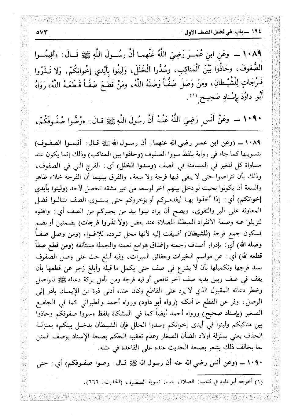 101091 - (وعن ابن عمر رضي الله عنهما أن رسول الله قال: أقيموا الصفوف) بتسويتها كما جاء في رواية بلفظ: سووا الصفوف (وحاذوا بين المناكب) وذلك إنما يكون عند مساواة كل للغير في المسامنة في الصف (وسدوا الخلل) أي الفرج التي في الصفوف وذلك بأن تتراصوا حتى لا يبقى فيها فرجة ولا سعة، والفرق بينهما أن الفرجة خلاء ظاهر، والسعة أن يكونوا بحيث لو دل بينهم آخر لوسعه من غير مشقة تحصل لأحد (ولينوا بأيدي إخوانكم) أي إذا أخذوا بها ليقدموكم أو يؤخروكم حتى يستوي الصف لتنالوا فضل المعاونة على البر والتقوى، ويصح أن يراد: لينوا بيد من يجركم من الصف: أي وافقوه ليزيلوا عنه وصمة الانفراد المبطلة للصلاة عند بعض (ولا تذروا فرجات) بضمتين أو بضم فسكون جمع فرجة (للشيطان) أضيفت إليه لأنها محل تردده للإغواء (ومن وصل صفا وصله الله) أي بإدرار أصناف رحمته وإغداق هوامع نعمته والجملة مستأنفة (ومن قطع صفاً قطعه الله) أي عن مواسم الخيرات وحقائق المبرات. وفيه أبلغ حث على وصل الصفوف بسد فروجها وتكميلها بأن لا يشرع في صف حتى يكمل ما قبله، وأبلغ زجر عن قطعها بأن يقف في صف وبين يديه صف آخر ناقص أو فيه فرجة، ومن تأمل بركة دعائه للواصل وخطر دعائه المقبول الذي لا يرد على القاطع وكان عنده أدنى ذرة من الإيمان بادر إلى الوصل وفر عن القطع ما أمكنه (رواه أبو داود) ورواه أحمد والطبراني كما في «الجامع الصغير» (بإسناد صحيح) ورواه أحمد أيضاً كما في «المشكاة» بلفظ «سووا صفوفكم وحاذوا بين مناكبكم ولينوا في أيدي إخوانكم وسدوا الخلل فإن الشيطان يدخل بينكم بمنزلة الحذف» يعني بمنزلة أولاد الضأن الصغار، وعدم تعقيبه الحكم بصحة الإسناد بوصف المتن بما يخالف ذلك يشعر بصحة الحديث عنده على القاعدة في مثله.