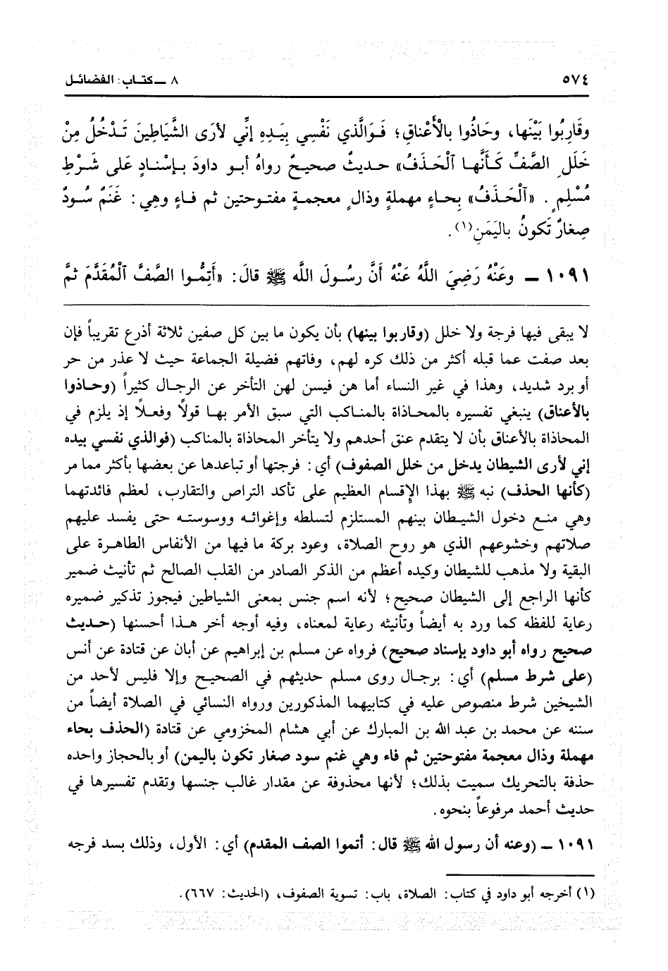 لا يبقى فيها فرجة ولا خلل (وقاربوا بينها) بأن يكون ما بين كل صفين ثلاثة أذرع تقريباً، فإن بعد صف عما قبله أكثر من ذلك كره لهم وفاتهم فضيلة الجماعة حيث لا عذر من حر أو برد شديد وهذا في غير النساء، أما هن فيسن لهن التأخر عن الرجال كثيراً (وحاذوا بالأعناق) ينبغي تفسيره بالمحاذاة بالمناكب التي سبق الأمر بها قولاً وفعلاً، إذ يلزم في المحاذاة بالأعناق بأن لا يتقدم عنق أحدهم ولا يتأخر المحاذاة بالمناكب (فوالذي نفسي بيده إني لأرى الشيطان يدخل من خلل الصفوف) أي فرجها أو تباعدها عن بعضها بأكثر مما مرّ (كأنها الحذف) ببه بهذا الإقسام العظيم على تأكيد التراص والتقارب لعظم فائدتهما وهي منع دخول الشيطان بينهم المستلزم لتسلطه وإغوائه ووسوسته حتى يفسد عليهم صلاتهم وخشوعهم الذي هو روح الصلاة وعود بركة ما فيها من الأنفاس الطاهرة على البقية، ولا مذهب للشيطان وكيده أعظم من الذكر الصادر من القلب الصالح ثم تأنيث ضمير كأنها الراجع إلى الشيطان صحيح لأنه اسم جنس بمعنى الشياطين فيجوز تذكير ضميره رعاية للفظه كما ورد به أيضاً وتأنيثه رعاية لمعناه وفيه أوجه أخر هذا أحسنها (حديث صحيح رواه أبو داود بإسناد صحيح) فرواه عن مسلم بن إبراهيم عن أبان، عن قتادة، عن أنس (على شرط مسلم) أي برجال روى مسلم حديثهم في الصحيح، وإلا فليس لأحد من الشيخين شرط منصوص عليه في كتابيهما المذكورين، ورواه النسائي في الصلاة أيضاً من «سننه» عن محمد بن عبد الله بن المبارك عن أبي هشام المخزومي عن قتادة.