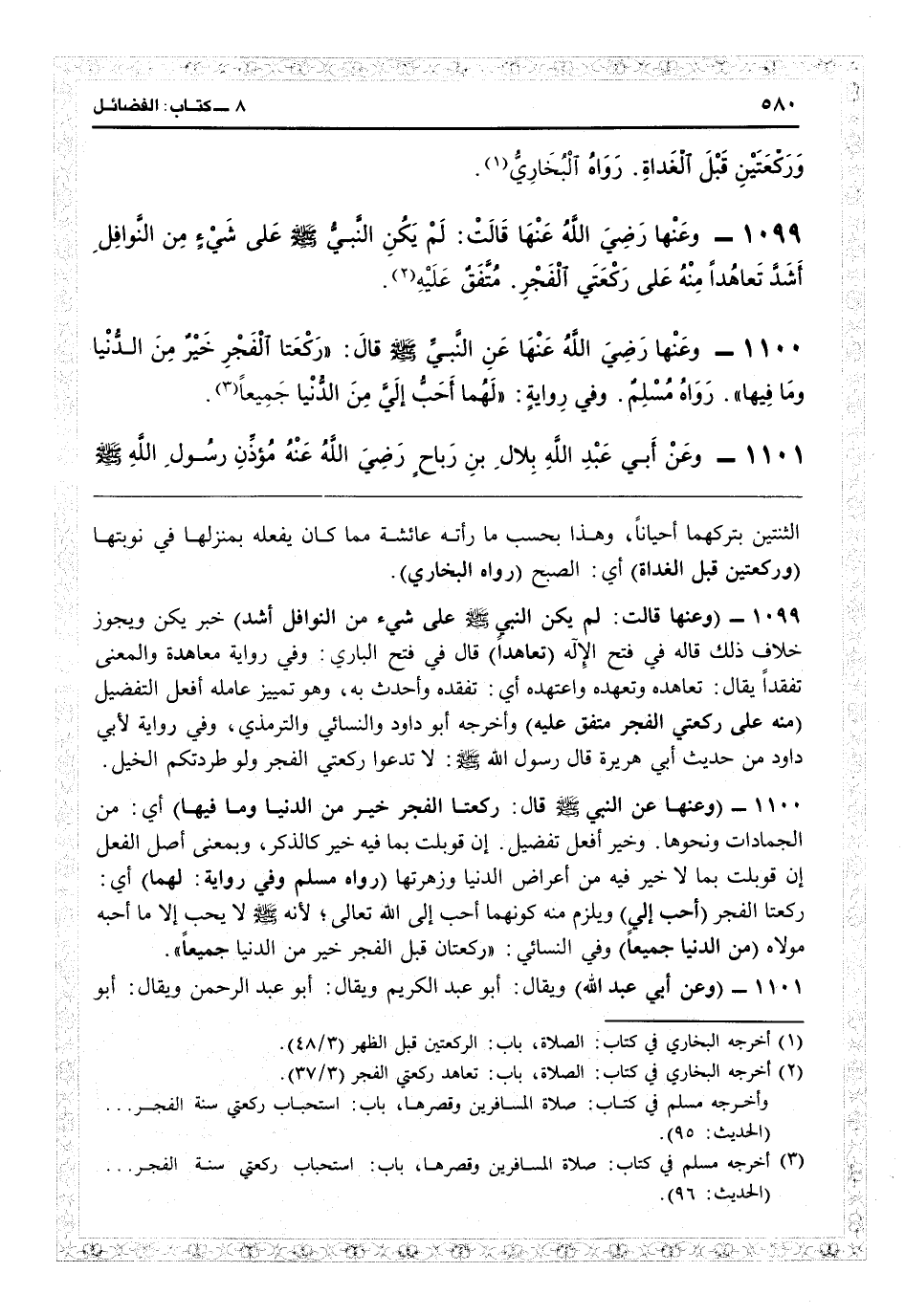21101 - (وعنها قالت: لم يكن النبي على شيء من النوافل أشد) خبر يكن، ويجوز خلاف ذلك، قاله في «فتح الإله» (تعاهداً) قال في «فتح الباري» : وفي رواية معاهدة والمعنى تفقداً، يقال تعاهده وتعهده واعتهده: أي تفقده وأحدث به وهو تمييز عامله أفعل التفضيل (منه على ركعتي الفجر متفق عليه) وأخرجه أبو داود والنسائي والترمذي في رواية لأبي داود من حديث أبي هريرة قال: قال رسول الله «لا تدعوا ركعتي الفجر ولو طردتكم الخيل» .
