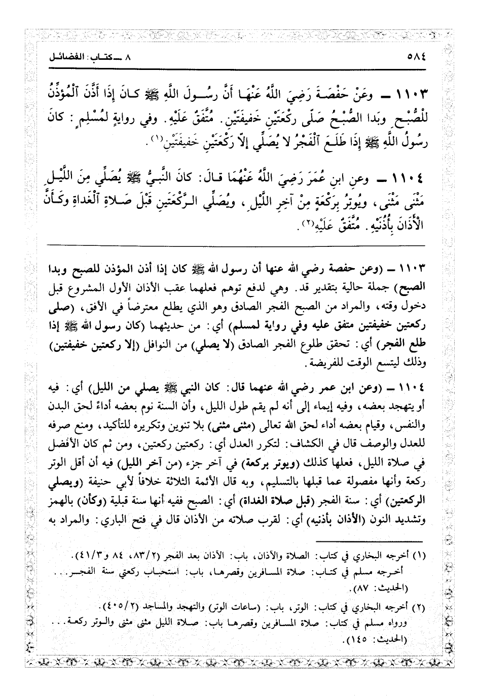 21105 - (وعن حفصة رضي الله عنها أن رسول الله: كان إذا أذن المؤذن للصبح وبدأ الصبح) جملة حالية بتقدير قد، وهي لدفع توهم فعلهما عقب الأذان الأول المشروع قبل دخول وقته، والمراد من الصبح الفجر الصادق وهو الذي يطلع معترضاً في الأفق (صلى ركعتين خفيفتين، متفق عليه) .