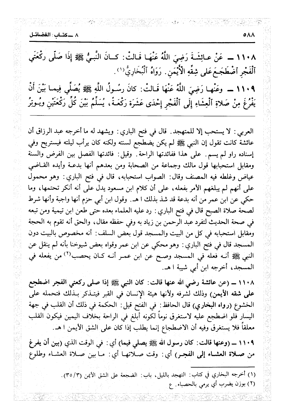 11110 - (عن عائشة رضي الله عنها قالت: كان النبي إذا صلى ركعتي الفجر اضطجع على شقه الأيمن) وذلك لشرفه ولأنها هيئة الإنسان في القبر فيتذكر بذلك فتحمله على الخشوع (رواه البخاري) قال الحافظ في «الفتح» : قيل الحكمة في ذلك أن القلب في جهة اليسار، فلو اضطجع عليه لاستغرق نوماً لكونه أبلغ في الراحة، بخلاف اليمين فيكون القلب معلقاً فلا يستغرق. وفي أن الاضطجاع إنما يطلب إذا كان على الشق الأيمن اهـ.