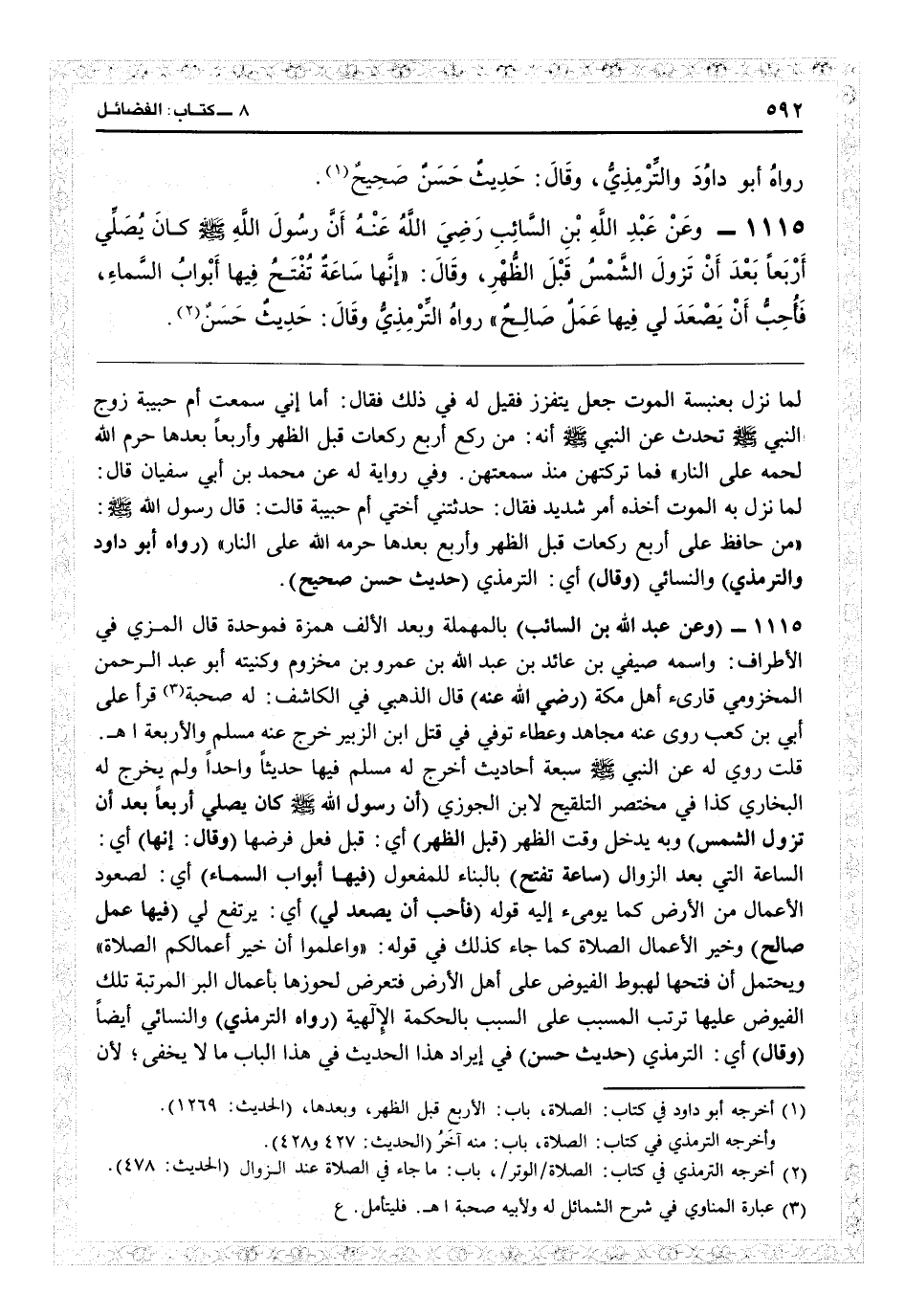 51117 - (وعن عبد الله بن السائب) بالمهملة وبعد الألف همزة فموحدة قال المزي في «الأطراف» : واسمه صيفي بن عائذ بن عبد الله بن عمرو بن مخزوم، وكنيته أبو عبد الرحمن المخزومي قارىء أهل مكة (رضي الله عنه) قال الذهبي في «الكاشف» : له صحبة قرأ على أبيّ ابن كعب، روى عنه مجاهد وعطاء. توفي في قتل ابن الزبير. خرج عنه مسلم والأربعة اهـ. قلت: روي له عن النبيّ سبعة أحاديث أخرج له مسلم فيها حديثاً واحداً ولم يخرج له البخاري، كدا في «مختصر التلقيح» لابن الجوزي (أن رسول الله كان يصلي أربعاً بعد أن تزول الشمس) وبه يدخل وقت الظهر (قبل الظهر) أي قبل فعل فرضها (وقال إنها) أي الساعة التي بعد الزوال (ساعة تفتح) بالبناء للمفعول (فيها أبواب السماء) أي لصعود الأعمال من الأرض كما يومىء إليه قوله (فأحب أن يصعد لي) أي يرتفع لي (فيها عمل صالح) وخير الأعمال الصلاة كما جاء كذلك في قوله «واعلموا أن خير أعمالكم الصلاة» ويحتمل أن فتحها لهبوط الفيوض على أهل الأرض فتعرّض لحوزها بأعمال البر المرتبة تلك لفيوض عليها ترتب المسبب على السبب بالحكمة الإلهية (رواه الترمذي) والنسائي أيضاً (وقال) أي الترمذي (حديث حسن) في إيراد هذا الحديث في هذا الباب ما لا يخفى لأن