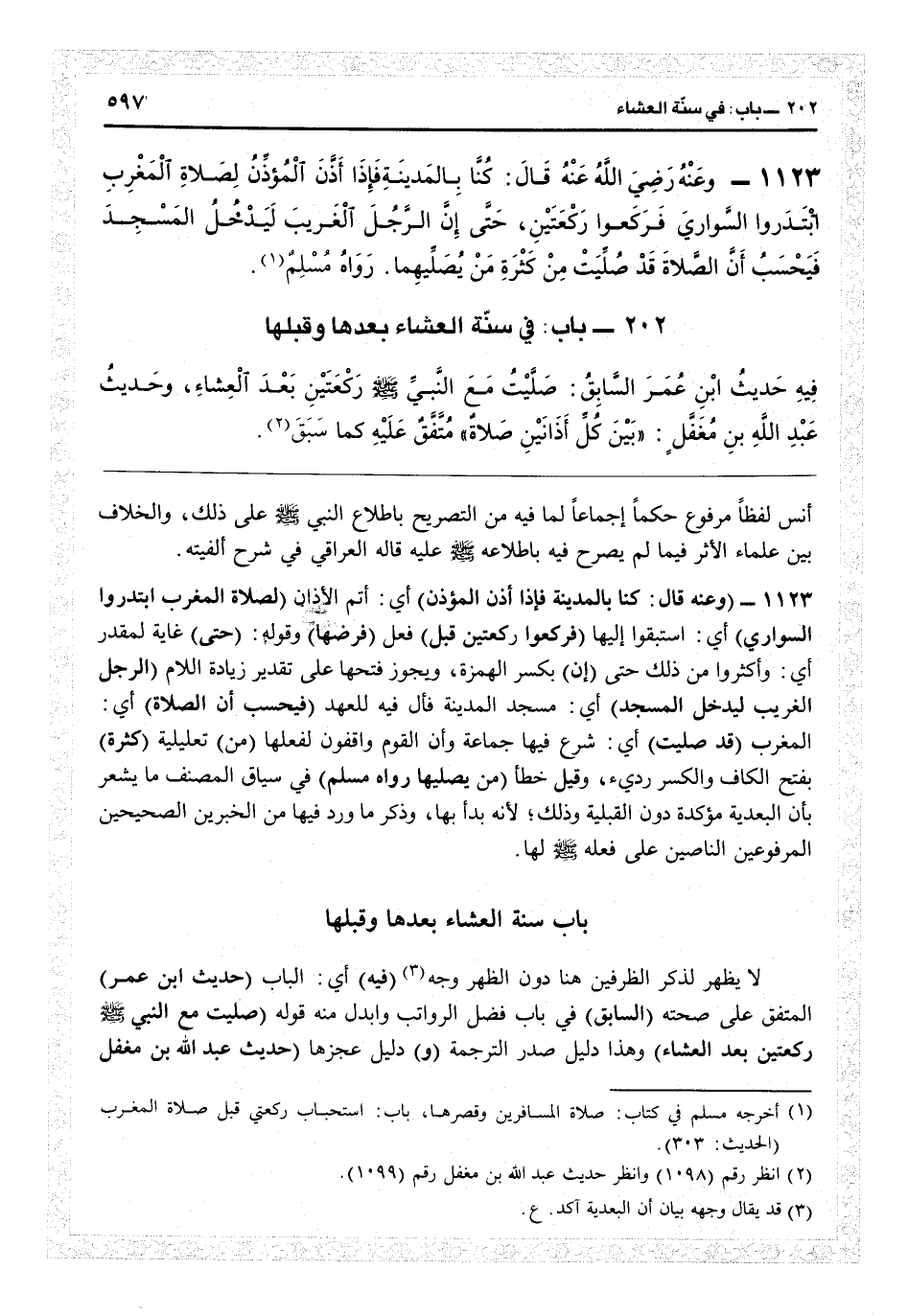 41125 - (وعنه قال: كنا بالمدينة فإذا أذن المؤذن) أي أتم الأذان (لصلاة المغرب ابتدروا السواري) أي استبقوا إليها (فركعوا ركعتين قبل) فعل (فرضها) وقوله (حتى) غاية لمقدر: أي وأكثروا من ذلك حتى (إن) بكسر الهمزة ويجوز فتحها على تقدير زيادة اللام (الرجل الغريب ليدخل المسجد) أي مسجد المدينة فأل فيه للعهد فيحسب أن الصلاة أي المغرب (قد صليت) أي شرع فيها جماعة وأن القوم واقفون لفعلها (من) تعليلية (كثرة) بفتح الكاف والكسر ردىء وقيل خطأ (من يصليهما. رواه مسلم) في سياق المصنف ما يشعر بأن البعدية مؤكدة دون القبلية، وذلك لأنه بدأ بها وذكر ما ورد فيها من الخبرين الصحيحين المرفوعين الناصين على فعله لها.