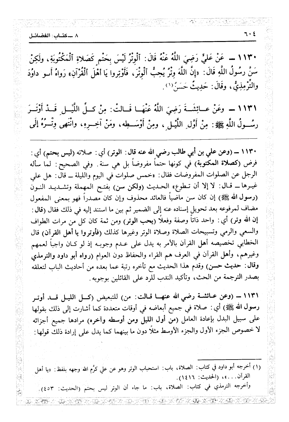 11132 - (عن عليّ بن أبي طالب رضي الله عنه: قال: الوتر) أي صلاته (ليس بحتم) أي فرض (كصلاة المكتوبة) في كونها حتماً مفروضاً بل هي سنة، وفي الصحيح: لما سأله عن الصلوات المفروضات فقال خمس صلوات في اليوم والليلة، قال: هل عليّ غيرها؟ قال لا إلا أن تطوّع. الحديث (ولكن سن) بفتح المهملة وتشديد النون (رسول الله) إن كان سن ماضياً فالعائد محذوف، وإن كان مصدراً فهي بمعنى المفعول مضاف لمرفوعه بعد تحويل إسناده عنه إلى الضمير، ثم بين ما استند إليه في ذلك فقال (قال إن الله وتر) أي واحد ذاتاً وصفة وفعلاً (يحب الوتر) ومن ثمة كان كل من مرات الطواف والسعي والرمي وتسبيحات الصلاة وصلاة الوتر وغيرها كذلك (فأوتروا يا أهل القرآن) قال الخطابي: تخصيصه أهل القرآن بالأمر به يدل على عدم وجوبه إذ لو كان واجباً لعمهم وغيرهم، وأهل القرآن في العرف هم القراء والحفاظ دون العوام (رواه أبو داود والترمذي وقال حديث حسن) وقدم هذا الحديث مع تأخره رتبة عما بعده من أحاديث الباب لتعلقه بصدر الترجمة من الحث وتأكيد الندب، للرد على القائلين بوجوبه.