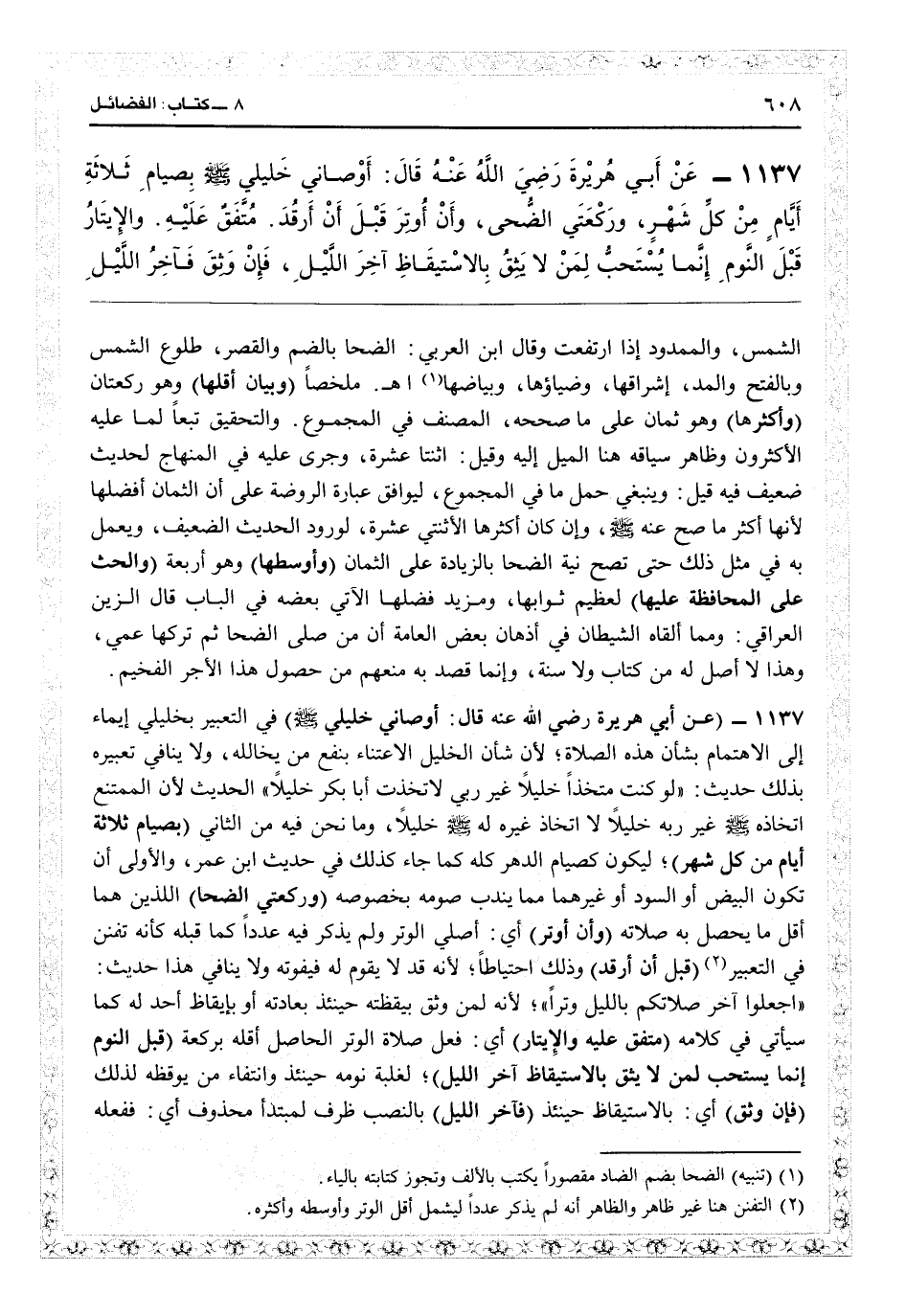 11139 - (عن أبي هريرة رضي الله عنه قال: أوصاني خليلي) في التعبير بخليل إيماء إلى الاهتمام بشأن هذه الصلاة، لأن شأن الخيل الاعتناء بنفع من يخالله، ولا ينافي تعبيره بذلك حديث «لو كنت متخذاً خليلاً غير ربي لاتخذت أبا بكر خليلاً» الحديث لأن الممتنع اتخاذه غير ربه خليلاً لا اتخاذ غيره له خليلاً وما نحن فيه من التاني (بصيام ثلاثة أيام من كل شهر) ليكون كصيام الدهر كله كما جاء كذلك في حديث ابن عمر، والأولى أن تكون البيض أو السود أو غيرهما مما يندب صومه بخصوصه (وركعتي الضحا) اللذين هما أقل ما يحصل به صلاته (وأن أوتر) أي أصلي الوتر ولم يذكر فيه عدداً كما قبله كأنه تفنن في التعبير (قبل أن أرقد) وذلك احتياط لأنه قد لا يقوم له فيفوته، ولا ينافي هذا حديث «اجعلوا آخر صلاتكم بالليل وتراً» لأنه لمن وثق بيقظته حينئذ بعادته أو بإيقاظ أحد له كما سيأتي في كلامه (متفق عليه) .