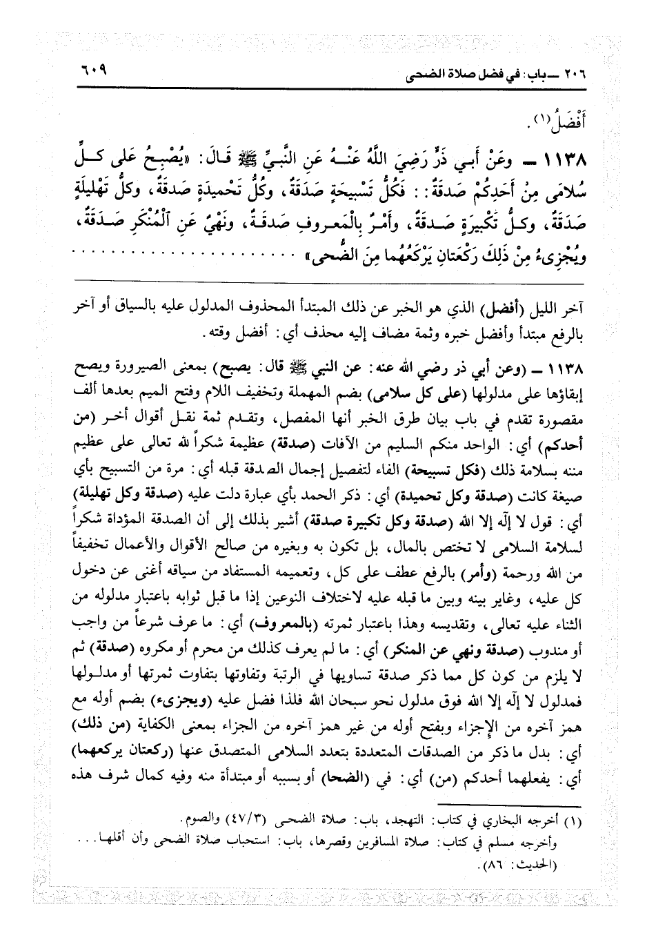 21140 - (وعن أبي ذرّ رضي الله عنه عن النبيّ قال: يصبح) بمعنى الصيرورة ويصح إبقاؤها على مدلولها (على كل سلامى) بضم المهملة وتخفيف اللام وفتح الميم بعدها ألف مقصورة، تقدم في باب بيان طرق الخير أنها المفصل وتقدم ثمة نقل أقوال أخر (من أحدكم) أي الواحد منكم السليم من الآفات (صدقة) عظيمة شكراً لله تعالى على عظيم مننه بسلامة ذلك (فكل تسبيحة) الفاء لتفصيل إجمال الصدقة قبله: أي مرة من التسبيح بأي صيغة كانت (صدقة وكل تحميدة) أي ذكر الحمد بأي عبارة دلت عليه (صدقة وكل تهليلة) أي قول لا إله إلا الله (صدقة، وكل تكبيرة صدقة) أشير بذلك إلى أن الصدقة المؤداة شكراً لسلامة السلامى لا تختص بالمال، بل تكون به وبغيره من صالح الأقوال والأعمال تخفيفاً من الله ورحمة (وأمر) بالرفع عطف على كل وتعميمه المستفاد من سياقه أغنى عن دخول كل عليه، وغاير بينه وبين ما قبله عليه لاختلاف النوعين، إذ ما قبل ثوابه باعتبار مدلوله من الثناء عليه تعالى وتقديسه وهذا باعتبار ثمرته (بالمعروف) أي ما عرف شرعاً من واجب أو مندوب (صدقة، ونهي عن المنكر) أي ما لم يعرف كذلك من محرم أو مكروه (صدقة) ثم لا يلزم من كون كل مما ذكر صدقة تساويها في الرتبة وتفاوتها بتفاوت ثمرتها أو مدلولها، فمدلول لا إله إلا الله فوق مدلول نحو سبحان الله فلذا فضل عليه (ويجزىء) بضم أوله مع همز آخره من الإجزاء وبفتح أوله من غير همز آخره من الجزاء بمعنى الكفاية (من ذلك) أي بدل ما ذكر من الصدقات المتعددة بتعدد السلامى المتصدق عنها (ركعتان يركعهما) أي يفعلهما أحدكم (من) أي في (الضحا) أو بسببه أو مبتدأة منه، وفيه كمال شرف هذه