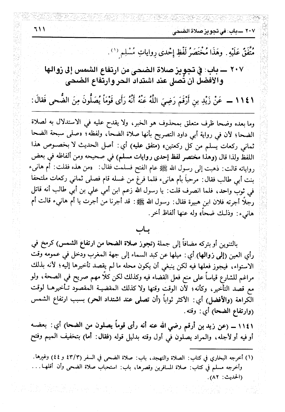 207 - بابٌ بالتنوين أو بتركه مضافاً إلى جملة (تجوز صلاة الضحى من ارتفاع الشمس) كرمح في رأى العين (إلى زوالها) أي ميلها عن كبد السماء إلى جهة المغرب، ودخل في عمومه وقت الاستواء فيجوز فعلها فيه، لكن ينبغي أن يكون محله مالم يقصد تأخيرها إليه لأنه بذلك مراغم للشارع قياساً على منع فعل القضاء فيه كذلك، لكن كلامهم صريح في الصحة ولو مع قصد التأخير، وكأنه لأن الوقت وقتها ولا كذلك المقضية المقصود تأخيرها لوقت الكراهة (والأفضل) أي الأكثر ثواباً (أن تصلى عند اشتداد الحر) بسبب ارتفاع الشمس (وارتفاع الضحا) أي وقته.