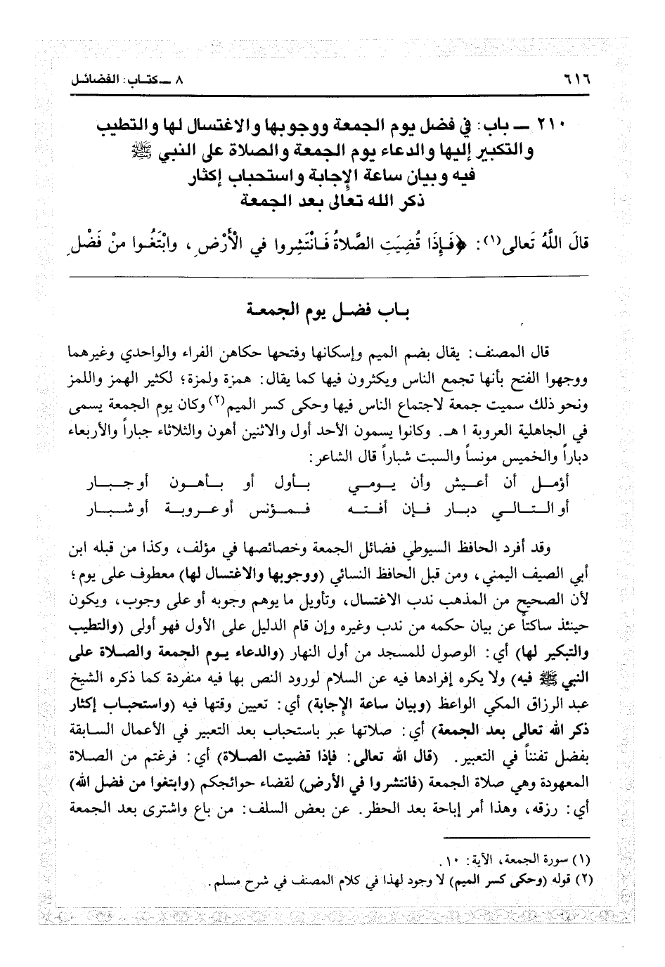 وقد أفرد الحافظ السيوطي فضائل الجمعة وخصائصها في مؤلف وكذا من قبله ابن أبي الصيف اليمني ومن قبله الحافظ النسائي (ووجوبها والاغتسال لها) معطوف على يوم لأن الصحيح من المذهب ندب الاغتسال وتأويل ما يوهم وجوبه، أو على وجوب ويكون حينئذ ساكتاً عن بيان حكمه من ندب وغيره، وإن قام الدليل على الأول فهو أولى (والطيب والتبكير لها) أي الوصول للمسجد من أول النهار (والدعاء يوم الجمعة والصلاة على النبي فيه) ولا يكره إفرادها فيه عن السلام لورود النص بها فيه منفردة كما ذكره الشيخ عبد الرزاق المكي الواعظ (وبيان ساعة الإجابة) أي تعيين وقتها فيه (واستحباب إكثار ذكر الله تعالى بعد الجمعة) أي صلاتها، عبر باستحباب بعد التعبير في الأعمال السابقة بفضل قمنا في التعبير.