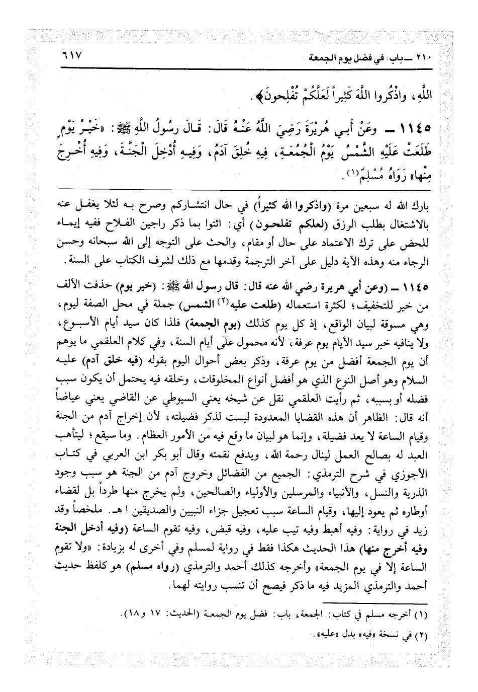 11147 - (وعن أبي هريرة رضي الله عنه قال: قال رسول الله: خير يوم) حذفت الألف من خير للتخفيف لكثرة استعماله (طلعت عليه الشمس) جملة في محل الصفة ليوم وهي مسوقة لبيان الواقع إذ كل يوم كذلك (يوم الجمعة) فلذا كان سيد أيام الأسبوع ولا ينافيه خبر «سيد الأيام يوم عرفة» لأنه محمول على أيام السنة، وفي كلام العلقمي ما يوهم أن يوم الجمعة أفضل من يوم عرفة. وذكر بعض أحوال اليوم بقوله (فيه خلق آدم) عليه السلام وهو أصل النوع الذي هو أفضل أنواع المخلوقات، وخلقه فيه يحتمل أن يكون سبب فضله أو بسببه، ثم رأيت العلقمي نقل عن شيخه يعني السيوطي عن القاضي يعني عياضا أنه قال: الظاهر أن هذه القضايا المعدودة ليست لذكر فضيله لأن إخراج آدم من الجنة وقيام الساعة لا يعد فضيلة، وإنما هو لبيان ما وقع فيه من الأمور العظام وما سيقع ليتأهب بصالح العمل لينال رحمة الله ويدفع نقمته. وقال أبو بكر بن العربي في كتابه «الأحوزي في شرح الترمذي» الجميع من الفضائل، وخروج آدم من الجنة هو سبب وجود الذرية والنسل والأنبياء والمرسلين والأولياء والصالحين، ولم يخرج منها طرداً بل لقضاء أوطاره ثم يعود إليها، وقيام الساعة سبب تعجيل جزاء النبيين والصديقين اهـ ملخصاً. وقد زيد في رواية «وفيه أهبط وفيه تيب عليه وفيه قبض وفيه تقوم الساعة» (وفيه أدخل الجنة وفيه أخرج منها) هذا الحديث هكذا فقط في رواية لمسلم، وفي أخرى له بزيادة «ولا تقوم الساعة إلا في يوم الجمعة» وأخرجه كذلك أحمد والترمذي (رواه مسلم) هو كلفظ حديث أحمد والترمذي المزيد فيه ما ذكر فيصح أن تنسب روايته لهما.