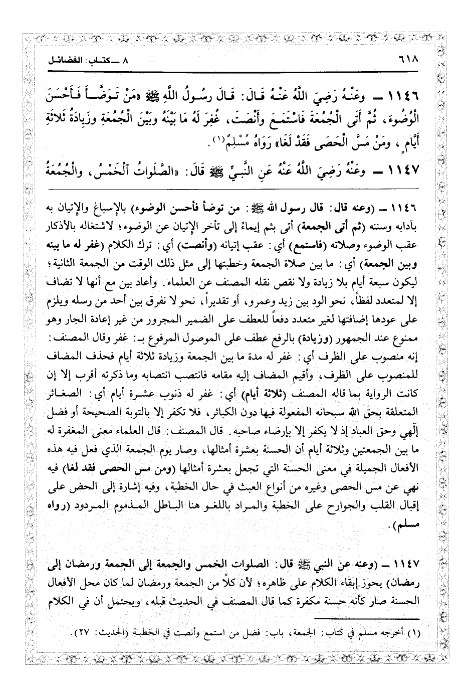 21148 - (وعنه قال: قال رسول الله: من توضأ فأحسن الوضوء) بالإسباغ والإتيان به بآدابه وسننه (ثم أتى الجمعة) أتى بثم إيماء إلى تأخر الإتيان عن الوضوء لاشتغاله بالأذكار عقب الوضوء وصلاته (فاستمع) أي عقب إتيانه (وأنصت) أي ترك الكلام (غفر له ما بينه وبين الجمعة) أي ما بين صلاة الجمعة وخطبتها إلى مثل ذلك الوقت من الجمعة الثانية ليكون سبعة أيام بلا زيادة ولا نقص، نقله المصنف عن العلماء، وأعاد بين مع أنها لا تضاف إلا لمتعدد لفظاً نحو الود بين زيد وعمرو أو تقديراً نحو لا نفرق بين أحد من رسله» ويلزم على عودها إضافتها لغير متعدد دفعاً للعطف على الضمير المجرور من غير إعادة الجار وهو ممنوع عند الجمهور (وزيادة) بالرفع عطف على الموصول المرفوع بغفر، وقال المصنف: إنه منصوب على الظرف: أي غفر له مدة ما بين الجمعة وزيادة ثلاثة أيام، فحذف المضاف المنصوب على الظرف وأقيم المضاف إليه مقامه فانتصب انتصابه، وما ذكرته أقرب إلا إن كانت الرواية بما قاله المصنف (ثلاثة أيام) أي غفر له ذنوب عشرة أيام: أي الصغائر المتعلقة بحق الله سبحانه المفعولة فيها دون الكبائر فلا تكفر إلا بالتوبة الصحيحة أو فضل إلهي، وحق العباد إذ لا يكفر إلا بارضاء صاحبه. قال المصنف: قال العلماء: معنى المغفرة له ما بين الجمعتين وثلاثة أيام أن الحسنة بعشرة أمثالها، وصار يوم الجمعة الذي فعل فيه هذه الأفعال الجميلة في معنى الحسنة التي تجعل بعشرة أمثالها (ومن مس الحصا فقد لغا) فيه نهي عن مس الحصى وغيره من أنواع العبث في حال الخطبة، وفيه إشارة إلى الحض على إقبال القلب والجوارح على الخطبة، والمراد باللغو هنا الباطل المذموم المردود (رواه مسلم) .g