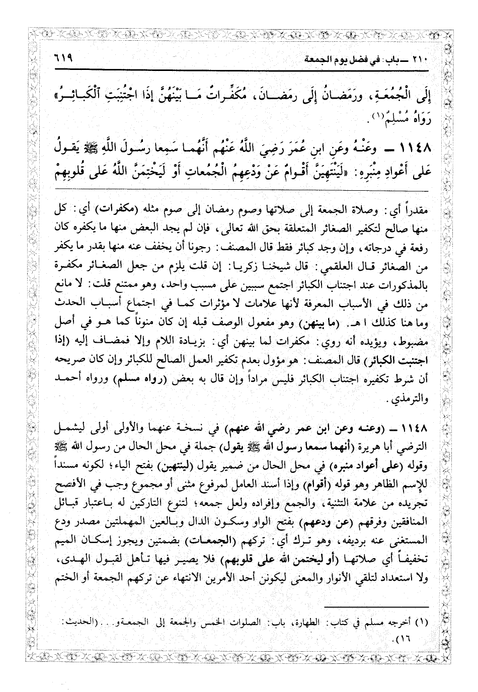 41150 - (وعنه عن ابن عمر رضي الله عنهم) في نسخة عنهما والأولى أولى ليشمل الترضي أبا هريرة (أنهما سمعا رسول الله يقول) جملة في محل الحال من رسول الله، وقوله (على أعواد منبره) في محل الحال من ضمير يقول (لينتهين) بفتح الياء لكونه مسنداً للاسم الظاهر وهو قوله (أقوام) وإذا أسند العامل لمرفوع مثنى أو مجموع وجب في الأفصح تجريده من علامة التثنية والجمع وإفراده، ولعل جمعه لتنوع التاركين له باعتبار قبائل المنافقين وفرقهم (عن ودعهم) بفتح الواو وسكون الدال وبالعين المهملتين مصدر ودع المستغني عنه برديفه وهو ترك: أي تركهم (الجمعات) بضمتين ويجوز إسكان الميم تخفيفاً: أي صلاتها (أو ليختمن الله على قلوبهم) فلا يصير فيها تأهل لقبول الهدى ولا استعداداً لتلقي الأنوار، والمعنى: ليكونن أحد الأمرين الانتهاء عن تركهم الجمعة أو الختم