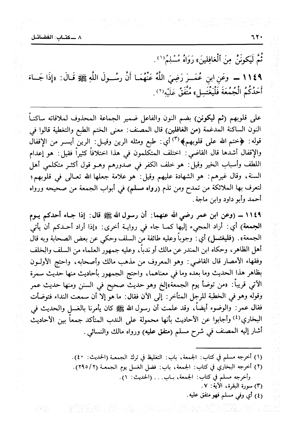 على قلوبهم (ثم ليكونن) بضم النون والفاعل ضمير الجماعة المحذوف لملاقاته ساكناً النون الساكنة المدغمة (من الغافلين) قال المصنف: معنى الختم الطبع والتغطية، قالوا في قوله {ختم الله على قلوبهم} (البقرة: 7) أي طبع، ومثله الرين، وقيل الرين أيسر من الطبع، والطبع أيسر الإقفال الإقفال أشدها، قال القاضي: اختلف المتكلمون في هذا اختلافاً كثيراً، فقيل هو إعدام اللطف وأسباب الخير، وقيل هو خلق الكفر في صدورهم وهو قول أكثر متكلمي أهل السنة، وقال غيرهم: هو الشهادة عليهم، وقيل هو علامة جعلها الله تعالى في قلوبهم لتعرف بها الملائكة من تمدح ومن تذم (رواه مسلم) في أبواب الجمعة من «صحيحه» ، ورواه أحمد. وأبو داود وابن ماجه.