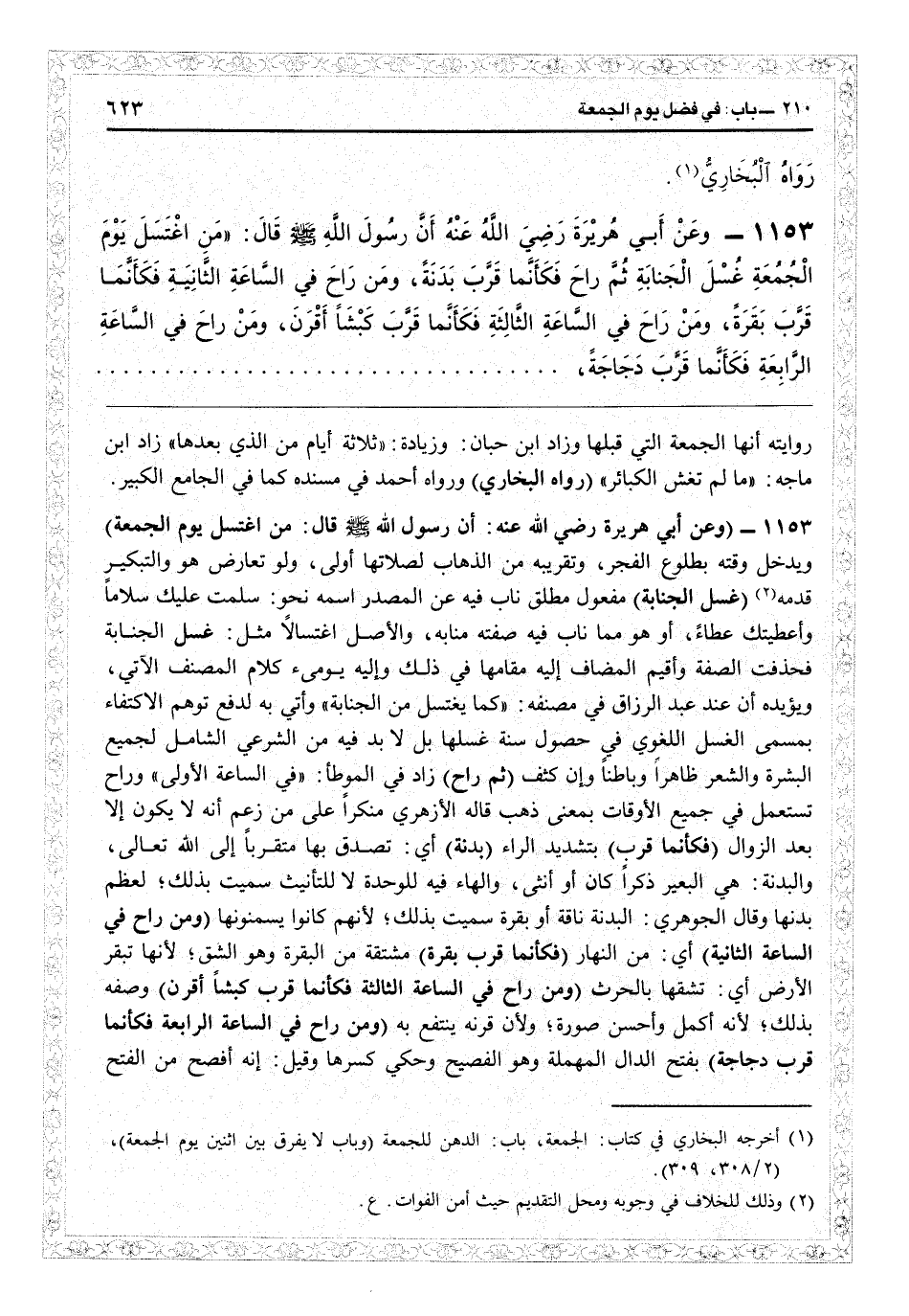 91155 - (وعن أبي هريرة رضي الله عنه أن رسول الله قال: من اغتسل يوم الجمعة) ويدخل وقته بطلوع الفجر وتقريبه من الذهاب لصلاتها أولى، ولو تعارض هو والتبكير قدمه (غسل الجنابة) مفعول مطلق ناب فيه عن المصدر اسمه نحو سلمت عليك سلاماً وأعطيتك عطاء، أو هو مما ناب فيه صفته منابه والأصل اغتسالاً مثل غسل الجنابة فحذفت الصفة وأقيم المضاف إليه مقامها في ذلك، وإليه يومىء كلام المصنف الآتي ويؤيده أن عند عبد الرزاق في «مصنفه» «كما يغتسل من الجنابة» وأتى به لدفع توهم الاكتفاء بمسمى الغسل اللغوي في حصول سنة غسلها، بل لا بد فيه من الشرعي الشامل لجميع البشرة والشعر ظاهراً وباطناً وإن كثف (ثم راح) زاد في «الموطأ» «في الساعة الأولى» وراح تستعمل في جميع الأوقات بمعنى ذهب، قاله الأزهري منكراً على من زعم أنه لا يكون، إلا بعد الزوال (فكأنما قرب) بتشديد الراء (بدنة) أي تصدق بها متقرباً إلى الله تعالى، والبدنة هي البعير ذكراً كان أو أنثى والهاء فيه للوحدة لا للتأنيث سميت بذلك لعظم بدنها، وقال الجوهري: البدنة ناقة أو بقرة سميت بذلك لأنهم كانوا يسمونها (ومن راح في الساعة الثانية) أي من النهار (فكأنما قرب بقرة) مشقة من البقر وهو الشق لأنها تبقر الأرض أي تشقها بالحرث (ومن راح في الساعة الثالثة فكأنما قرب كبشاً أقرن) وصفه بذلك لأنه أكمل وأحسن صورة ولأن قرنه ينتفع به (ومن راح في الساعة الرابعة فكأنما قرب دجاجة) ، بفتح الدال المهملة وهو الفصيح وحكي كسرها، وقيل إنه أفصح من الفتح،
