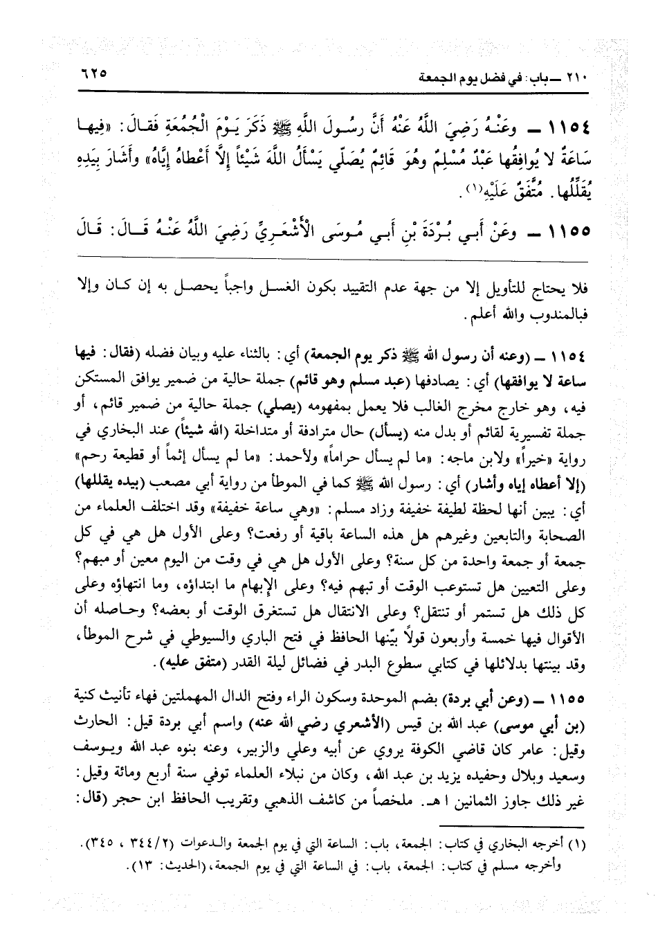 101156 - (وعنه أن رسول الله ذكر يوم الجمعة) أي بالثناء عليه وبيان فضله (فقال: فيها ساعة لا يوافقها) أي يصادفها (عبد مسلم وهو قائم) جملة حالية من ضمير وافق المستكن فيه وهو خارج مخرج الغالب فلا يعمل بمفهومه (يصلي) جملة حالية من ضمير قائم، أو جملة تفسيرية لقائم أو بدل منه (يسأل) حال مترادفة أو متداخلة (الله شيئاً) عند البخاري في رواية (خيراً) . ولابن ماجه «ما لم يسأل حراماً» ولأحمد «ما لم يسأل إثماً أو قطيعة رحم» (إلا أعطاه إياه وأشار) أي رسول الله كما في «الموطأ» من رواية أبي مصعب (بيده يقللها) أي يبين أنها لحظة لطيفة خفيفة، وزاد مسلم «وهي ساعة خفيفة» وقد اختلف العلماء من الصحابة والتابعين وغيرهم هل هذه الساعة باقية أو رفعت؟ وعلى الأول هل هي في كل جمعة أو جمعة واحدة من كل سنة؟ وعلى الأول هل هي في وقت من اليوم معين أو مبهم؟ وعلى التعيين هل تستوعب الوقت أو تبهم فيه؟ وعلى الإبهام ما اتبداؤه وما انتهاؤه وعلى كل ذلك هل تستمر أو تنتقل؟ وعلى الانتقال هل تستغرق الوقت أو بعضه؟ وحاصله أن الأقوال فيها خمسة وأربعون قولاً بينها الحافظ في «فتح الباري» والسيوطي في «شرح الموطأ» ، وقد بينتها بدلائلها في كتابي «سطوع البدر في فضائل ليلة القدر» (متفق عليه) .