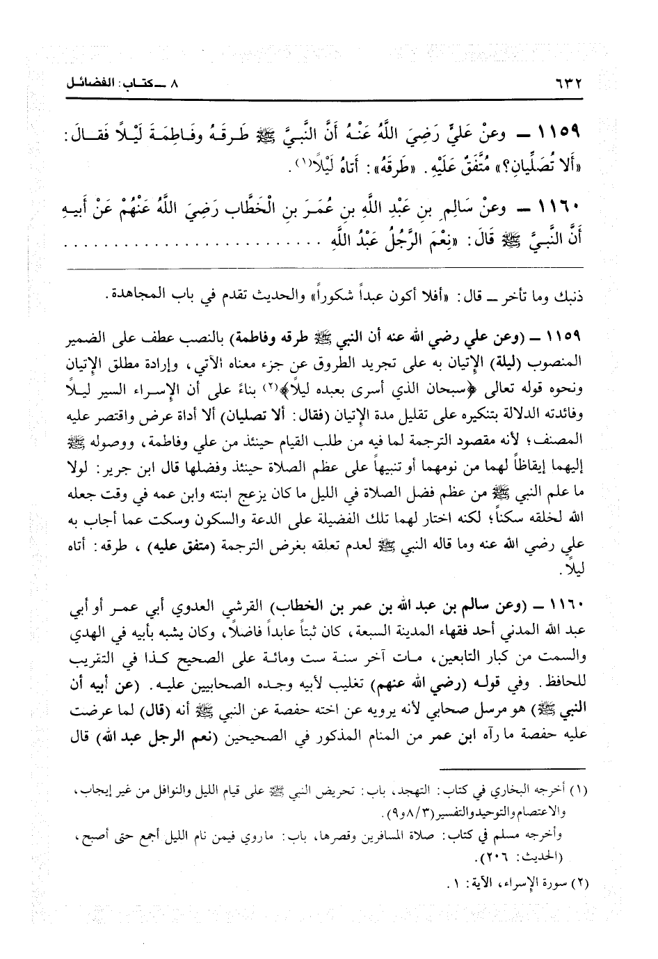 31161 - (وعن علي رضي الله عنه: أن النبي طرقه وفاطمة) بالنصب عطف على الضمير المنصوب (ليلة) الإتيان به على تجريد الطروق عن جزء معناه الآتي وإرادة مطلق الإتيان، ونحو قوله تعالى: {سبحان الذي أسرى بعبده ليلاً} (الإسراء: 1) بناء على أن الإسراء السير ليلاً وفائدته الدلالة بتنكيره على تقليل مدة الإتيان (فقال ألا تصليان) ألا أداة عرض، واقتصر عليه المصنف لأنّه مقصود الترجمة لما فيه من طلب القيام حينئذ من عليّ وفاطمة، ووصوله إليهما إيقاظاً لهما من نومهما، أو تنبيهاً على عظم الصلاة حينئذ وفضلها. قال ابن جرير: لولا ما علم النبي من عظم فضل الصلاة في الليل ما كان يزعج ابنته وابن عمه في وقت جعله الله لخلقه سكنا، لكنه اختار لهما تلك الفضيلة على الدعة والسكون، وسكت عما أجاب به على رضي الله عنه وما قاله النبيّ لعدم تعلقه بغرض الترجمة (متفق عليه. طرقه: أتاه ليلاً) .